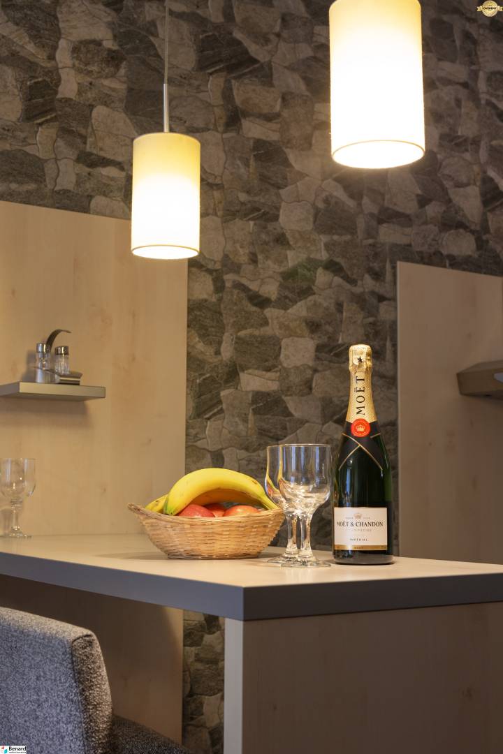 - výbava apartmánu: laminátové podlahy, drevené okná, murované jadro, keramické obklady v kúpeľni a WC, kuchynská linka na mieru
