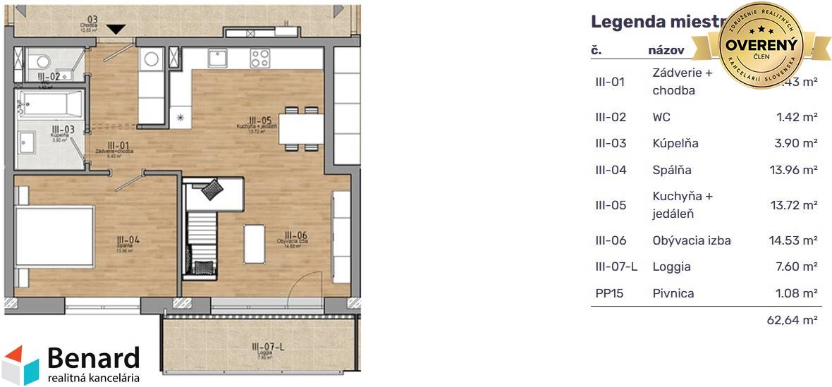 [b]Využite skvelú príležitosť a bývajte v novopostavenom bytovom dome v projekte Byty Rozálka v Pezinku.[/b] Spustili sme predaj ďalších bytových jednotiek v poradí treťom bytovom dome vo výstavbe. Celková výmera nehnuteľnosti je 61,56 m2, z čoho úžitková plocha bytu je 53,96 m2 a loggie 7,6 m2. Byt sa nachádza sa na 2. nadzemnom podlaží 6.poschodového bytového domu na Sasinkovej ulici v Pezinku. [b]BYTOVÝ DOM:[/b] Na prvom nadzemnom podlaží sa nachádza vstupná chodba, poštové schránky, pivničné kobky, garáže, obchodné priestory, výťah, miesto pre upratovaciu službu, elektrorozvodňa a kotolňa. Na ďalších podlažiach sú byty, pričom každý byt má vlastnú loggiu, na najvyššom poschodí terasu. Vstup do bytového domu je na kľúč alebo kód. Vidovrátnik s kamerou je nainštalovaný v každej bytovej jednotke. Dom je bezbariérový, má vlastnú kotolňu s plynovým kotlom a zásobníkmi teplej vody. Nachádza sa v ňom 20 bytových jednotiek Odovzdávanie bytov je naplánovené po kolaudácii, koncom roka 2025. [b]BYT:[/b] Predáva sa v stave holobyt. Nachádza sa na 2. nadzemnom podlaží a má južnú orientáciu. Dispozične pozostáva zo zádveria, chodby, obývacej izby s kuchyňou, samostatnej spálne, loggie, kúpeľne a WC. Loggia je s elegantným riešením zábrany s priehľadného tvrdeného skla. Vstupné dvere sú bezpečnostné, okná a dvere na loggiu sú plastové. Východ na loggiu je z obývacej izby. Vykurovacie telesá v bytoch sú radiátory, nainštalovaná je predpríprava pre klimatizáciu. K nehnuteľnosti prislúcha pivničná kobka o veľkosti 1,25 m2 na prvom nadzemnom podlaží. Možnosť pripojenia na optický kábel internetu (ORANGE, SWAN). https://www.bytyrozalka.sk/byty?bytu=402 [b]OKOLIE:[/b] Bytový dom sa nachádza na Sasinkovej ulici v novovybudovanej štvrti, na sídlisku Sever. Ponúka skvelé spojenie mestského života v prírode. Je situovaný v krásnom prostredí vinohradov, ale pritom na mieste s plnou občianskou vybavenosťou v pešej dostupnosti. Ponúka skvelé možnosti turistiky, cykloturistiky, alebo len príjemných prechádzok vinohradmi či lesmi Malých Karpát doslova za dverami Vášho bytu. Školy, škôlky, obchody, pošta, kúpalisko, zimný štadión, jazdecký areál či amfiteáter sa nachádzajú len pár minút chôdze od nehnuteľnosti. Pri financovaní nehnuteľnosti prostredníctvom HÚ je Vám k dispozícii náš hypotekárny špecialista bezplatne.