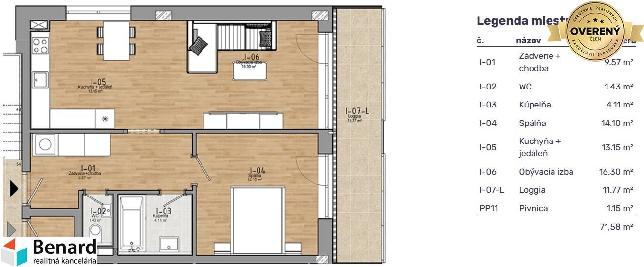[b]Využite skvelú príležitosť a bývajte v novopostavenom bytovom dome v projekte Byty Rozálka v Pezinku.[/b] Spustili sme predaj ďalších bytových jednotiek v poradí treťom bytovom dome vo výstavbe. Celková výmera nehnuteľnosti je 70,77 m2, z čoho úžitková plocha bytu je 58,67 m2 a loggie 12,10 m2. Byt sa nachádza sa na 5. nadzemnom podlaží 6.poschodového bytového domu na Sasinkovej ulici v Pezinku. [b]BYTOVÝ DOM:[/b] Na prvom nadzemnom podlaží sa nachádza vstupná chodba, poštové schránky, pivničné kobky, garáže, obchodné priestory, výťah, miesto pre upratovaciu službu, elektrorozvodňa a kotolňa. Na ďalších podlažiach sú byty, pričom každý byt má vlastnú loggiu, na najvyššom poschodí terasu. Vstup do bytového domu je na kľúč alebo kód. Vidovrátnik s kamerou je nainštalovaný v každej bytovej jednotke. Dom je bezbariérový, má vlastnú kotolňu s plynovým kotlom a zásobníkmi teplej vody. Nachádza sa v ňom 20 bytových jednotiek Odovzdávanie bytov je naplánovené po kolaudácii, koncom roka 2025. [b]BYT:[/b] Predáva sa v stave holobyt. Nachádza sa na 5. nadzemnom podlaží a má SV orientáciu. Dispozične pozostáva zo zádveria, chodby, obývacej izby s kuchyňou, samostatnej spálne, loggie, kúpeľne a WC. Pozdĺž celého bytu je loggia s elegantným riešením zábrany s priehľadného tvrdeného skla. Vstupné dvere sú bezpečnostné, okná a dvere na loggiu sú plastové. Východ na loggiu je možný rovnako z obývacej izby, ako aj spálne. Vykurovacie telesá v bytoch sú radiátory, nainštalovaná je predpríprava pre klimatizáciu. K nehnuteľnosti prislúcha pivničná kobka o veľkosti 1,76 m2 na prvom nadzemnom podlaží. Možnosť pripojenia na optický kábel internetu (ORANGE, SWAN). https://www.bytyrozalka.sk/byty?bytu=418 [b]OKOLIE:[/b] Bytový dom sa nachádza na Sasinkovej ulici v novovybudovanej štvrti, na sídlisku Sever. Ponúka skvelé spojenie mestského života v prírode. Je situovaný v krásnom prostredí vinohradov, ale pritom na mieste s plnou občianskou vybavenosťou v pešej dostupnosti. Ponúka skvelé možnosti turistiky, cykloturistiky, alebo len príjemných prechádzok vinohradmi či lesmi Malých Karpát doslova za dverami Vášho bytu. Školy, škôlky, obchody, pošta, kúpalisko, zimný štadión, jazdecký areál či amfiteáter sa nachádzajú len pár minút chôdze od nehnuteľnosti. Pri financovaní nehnuteľnosti prostredníctvom HÚ je Vám k dispozícii náš hypotekárny špecialista bezplatne.