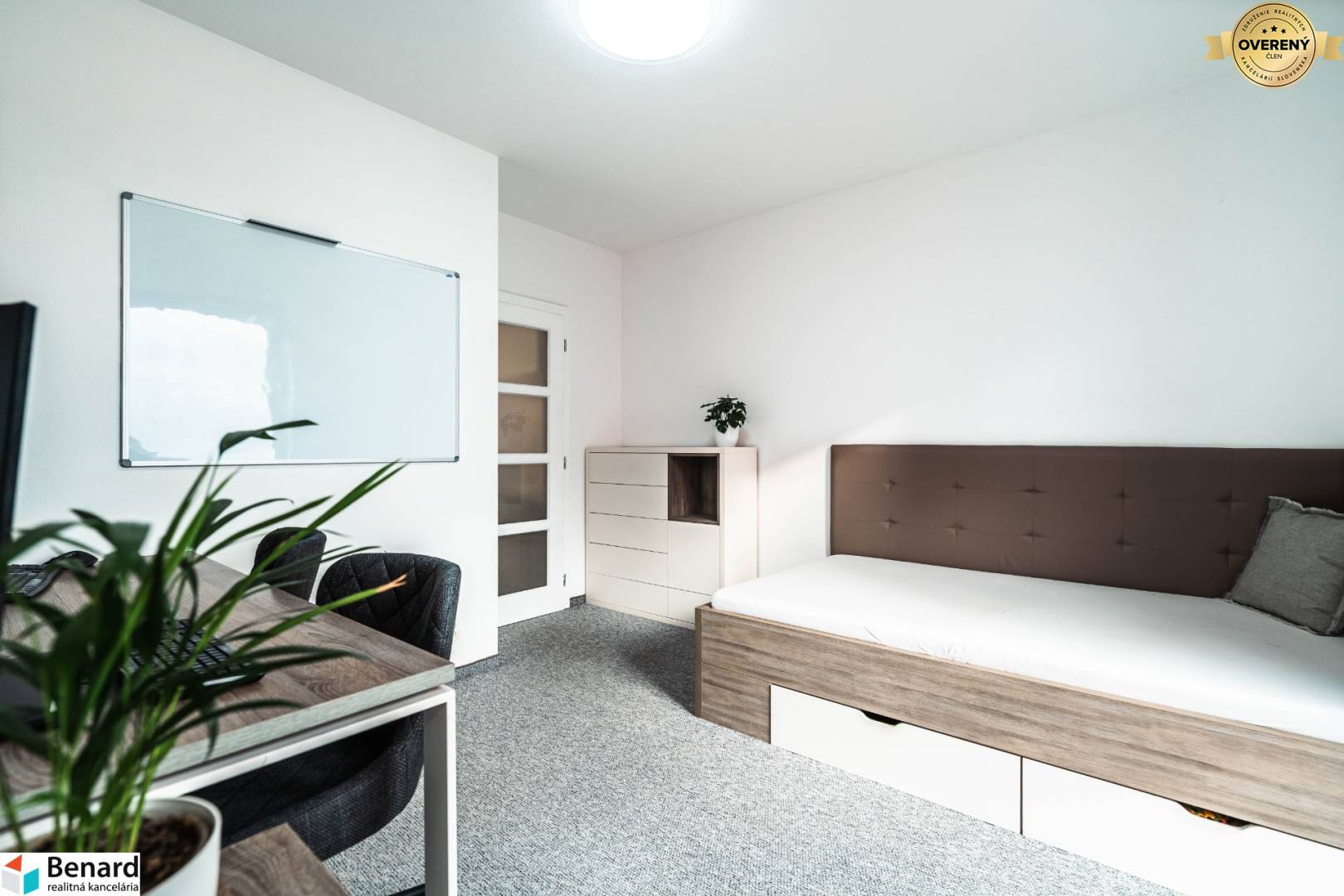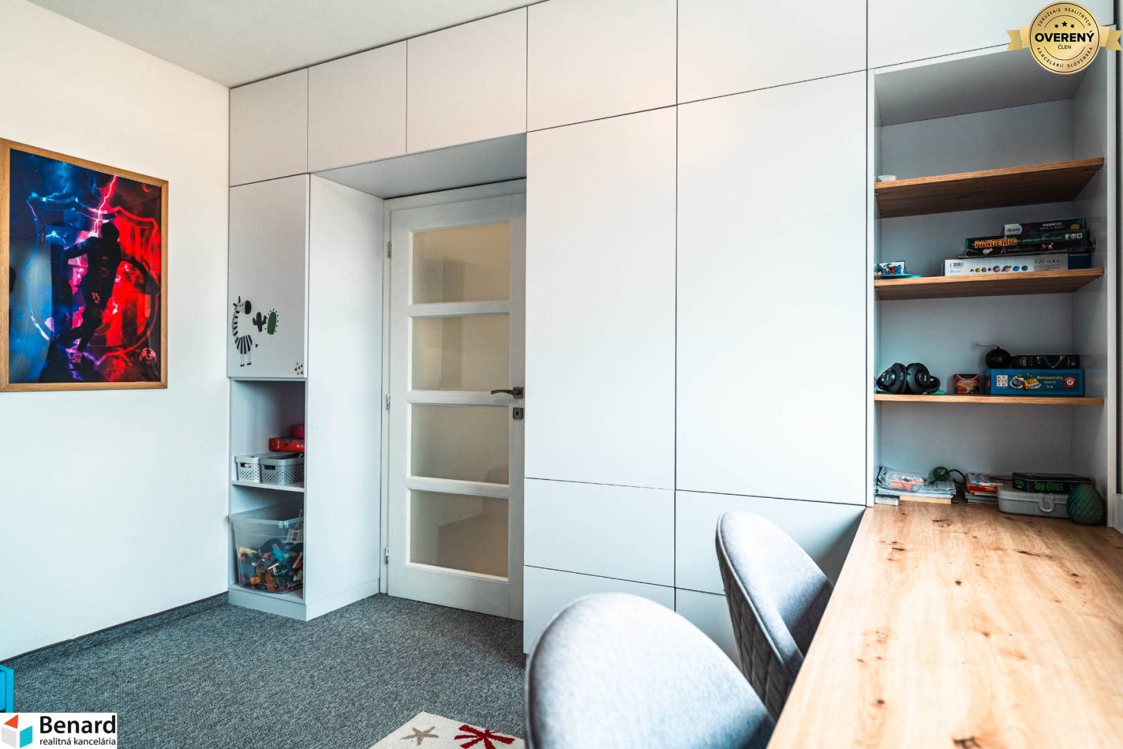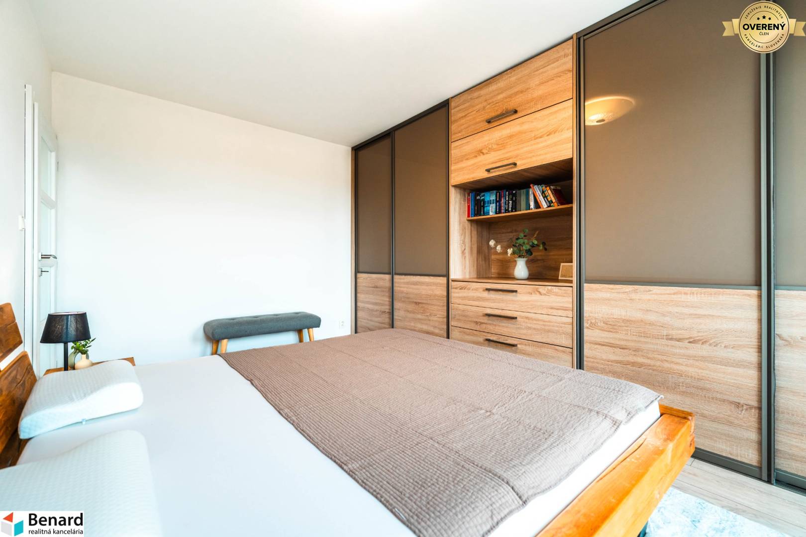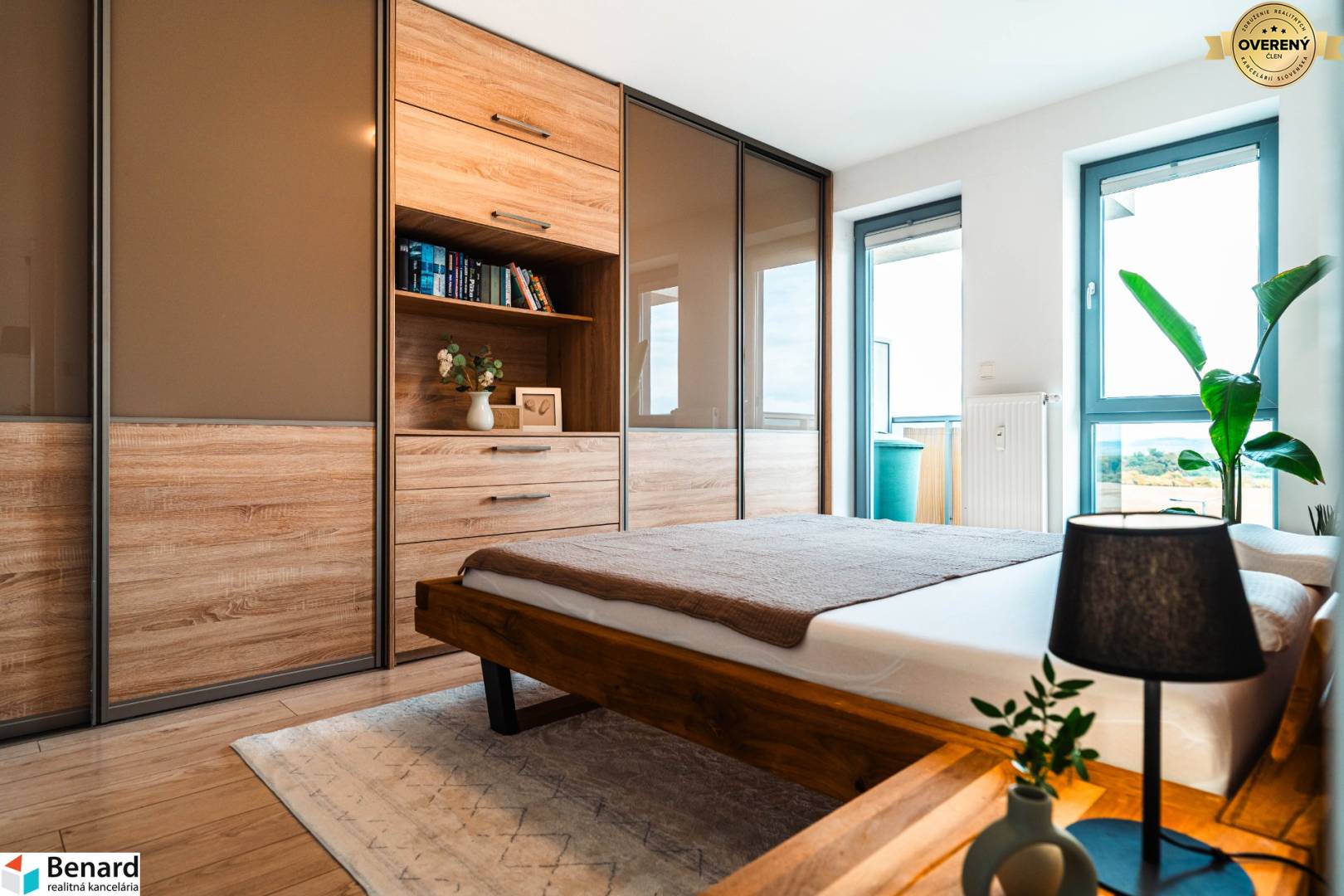 Hľadáte priestranný a moderný byt už v skolaudovanej novostavbe, ktorý je zariadený? Máme pre Vás na predaj 4-izbový byt s kumbálom, ktorý je oproti bytu, priamo na poschodí. Nehnuteľnosť sa nachádza na Jelšovej ulici, v obľúbenom projekte Panoráma. Ak si potrpíte na prostredie, v ktorom žijete a túžite po čerstvom vzduchu, či výhľade na lúky a lesy, tak Panoráma je pre vás ideálnou voľbou. Okolitá príroda a les ponúkajú pestré možnosti oddychu a rekreácie. Nájdete tu materskú školu, ohradený areál, kde sú detské ihriská, krásne a záhradníkom udržiavané pozemky, aj zastávku MHD. Rodičia určite ocenia, že za bytovými domami sa nachádza 250 metrov dlhý a oplotený dvor, kde sa môžu ich deti bezpečne hrať. Jednoducho všetko, čo potrebujete pre pohodlný, každodenný život. Táto lokalita je ideálnym miestom pre rodiny a pre komunitný život. Bytový dom je postavený z tehly a je zateplený prírodným materiálom, s 15-centimetrovou minerálnou vlnou. V bytovke sú štyri poschodia a predávaná nehnuteľnosť sa nachádza na 3. p. Byt je priestranný a má skvelé rozloženie. Spálňa, detská izba a pracovňa majú samostatné vstupy, sú nepriechodné. Kupujúci určite ocenia, že v byte sú dve toalety a dva samostatné balkóny, na ktoré sa dostanete z obývačky a zo spálne. Môžete si tak vychutnávať výhľady na okolitú prírodu. V dennej časti sa nachádza spojená obývačka s kuchyňou, kde je klimatizácia. V byte sú kvalitné okná s trojsklom. V bytovke sa nachádza plynová kotolňa, ktorá slúži na vykurovanie a ohrev úžitkovej vody, preto sú tu nízke mesačné náklady. Výhodou bytu je praktický kumbál, umiestnený oproti bytu, ktorý je zahrnutý v cene nehnuteľnosti. K bytu je možnosť dokúpiť parkovacie miesto priamo pri bytovom dome, ako aj pivnicu na prízemí bytového domu. Zakúpenie parkovacieho miesta ani pivnice nie je podmienkou kúpy. Cena parkovacieho miesta je 12 000 € a cena pivnice je 12 000 €. Výhody Vášho budúceho domova sú: - nízke mesačné náklady, - byt je priestranný, - byt má dva balkóny s krásnym výhľadom, - k dispozícii je kumbál, ktorý sa nachádza oproti bytu, - tiché bývanie s množstvom zelene, - možnosť zakúpiť si parkovacie miesto, ktoré je hneď pri bytovom dome, - možnosť zakúpiť si pivnicu, ktorá je na prízemí bytového domu, - celková plocha bytu je 102 m2 a plocha obytných miestností je 92,43 m2. Príďte sa o týchto, a aj iných výhodách presvedčiť sami a rezervujte si obhliadku na čísle 0903 367 922.