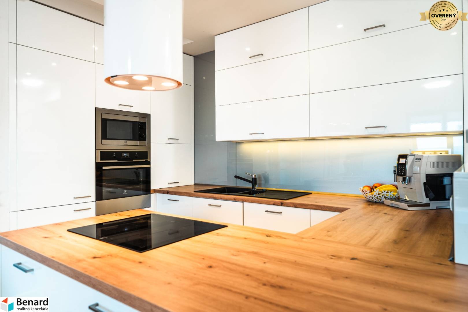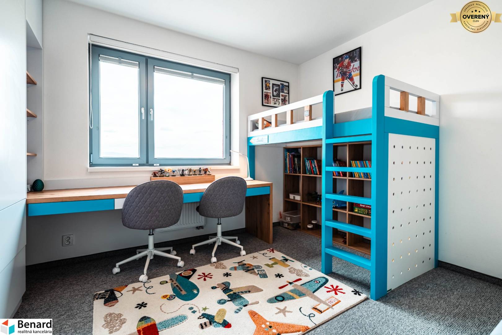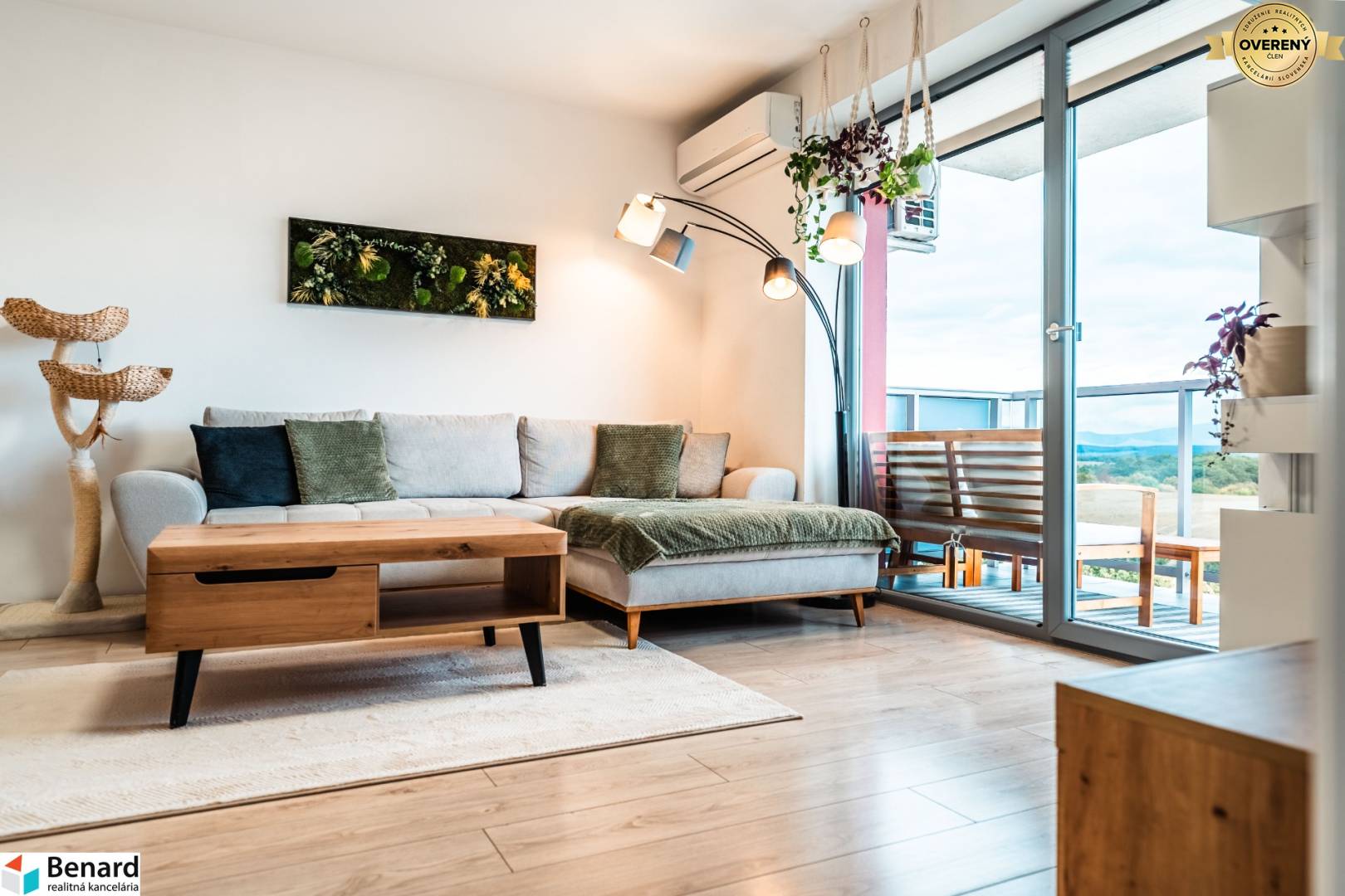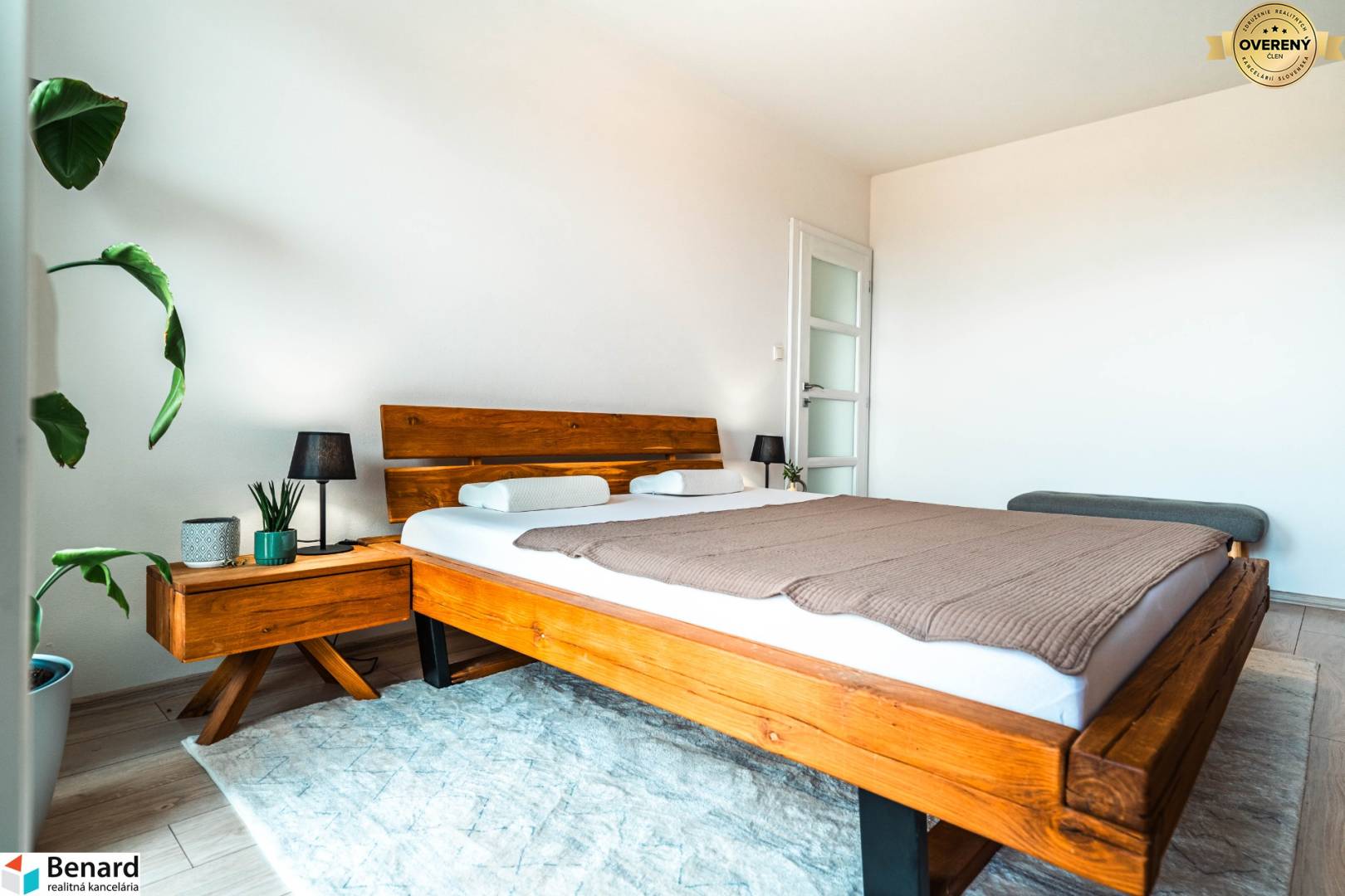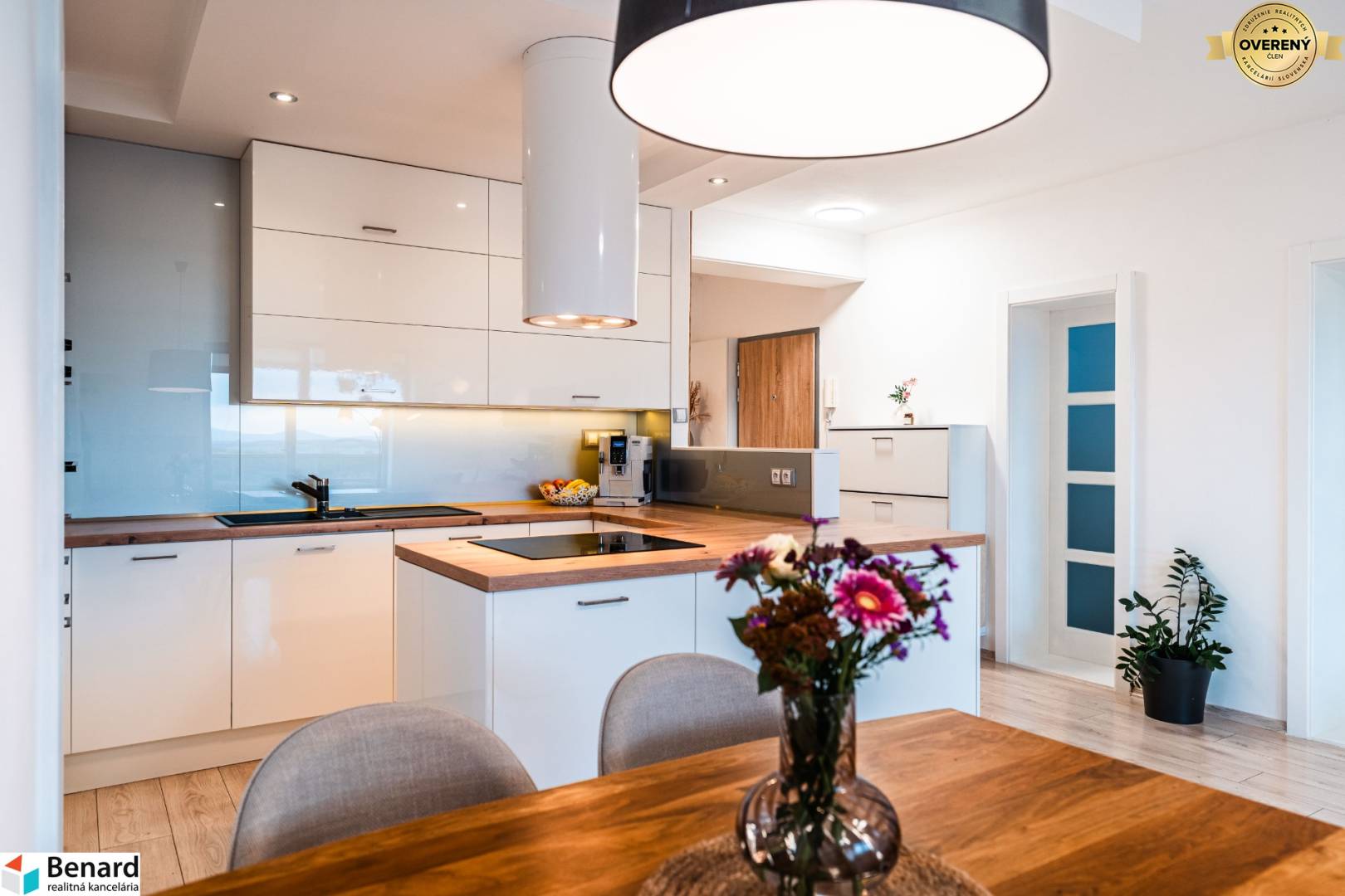 Hľadáte priestranný a moderný byt už v skolaudovanej novostavbe, ktorý je zariadený? Máme pre Vás na predaj 4-izbový byt s kumbálom, ktorý je oproti bytu, priamo na poschodí. Nehnuteľnosť sa nachádza na Jelšovej ulici, v obľúbenom projekte Panoráma. Ak si potrpíte na prostredie, v ktorom žijete a túžite po čerstvom vzduchu, či výhľade na lúky a lesy, tak Panoráma je pre vás ideálnou voľbou. Okolitá príroda a les ponúkajú pestré možnosti oddychu a rekreácie. Nájdete tu materskú školu, ohradený areál, kde sú detské ihriská, krásne a záhradníkom udržiavané pozemky, aj zastávku MHD. Rodičia určite ocenia, že za bytovými domami sa nachádza 250 metrov dlhý a oplotený dvor, kde sa môžu ich deti bezpečne hrať. Jednoducho všetko, čo potrebujete pre pohodlný, každodenný život. Táto lokalita je ideálnym miestom pre rodiny a pre komunitný život. Bytový dom je postavený z tehly a je zateplený prírodným materiálom, s 15-centimetrovou minerálnou vlnou. V bytovke sú štyri poschodia a predávaná nehnuteľnosť sa nachádza na 3. p. Byt je priestranný a má skvelé rozloženie. Spálňa, detská izba a pracovňa majú samostatné vstupy, sú nepriechodné. Kupujúci určite ocenia, že v byte sú dve toalety a dva samostatné balkóny, na ktoré sa dostanete z obývačky a zo spálne. Môžete si tak vychutnávať výhľady na okolitú prírodu. V dennej časti sa nachádza spojená obývačka s kuchyňou, kde je klimatizácia. V byte sú kvalitné okná s trojsklom. V bytovke sa nachádza plynová kotolňa, ktorá slúži na vykurovanie a ohrev úžitkovej vody, preto sú tu nízke mesačné náklady. Výhodou bytu je praktický kumbál, umiestnený oproti bytu, ktorý je zahrnutý v cene nehnuteľnosti. K bytu je možnosť dokúpiť parkovacie miesto priamo pri bytovom dome, ako aj pivnicu na prízemí bytového domu. Zakúpenie parkovacieho miesta ani pivnice nie je podmienkou kúpy. Cena parkovacieho miesta je 12 000 € a cena pivnice je 12 000 €. Výhody Vášho budúceho domova sú: - nízke mesačné náklady, - byt je priestranný, - byt má dva balkóny s krásnym výhľadom, - k dispozícii je kumbál, ktorý sa nachádza oproti bytu, - tiché bývanie s množstvom zelene, - možnosť zakúpiť si parkovacie miesto, ktoré je hneď pri bytovom dome, - možnosť zakúpiť si pivnicu, ktorá je na prízemí bytového domu, - celková plocha bytu je 102 m2 a plocha obytných miestností je 92,43 m2. Príďte sa o týchto, a aj iných výhodách presvedčiť sami a rezervujte si obhliadku na čísle 0903 367 922.