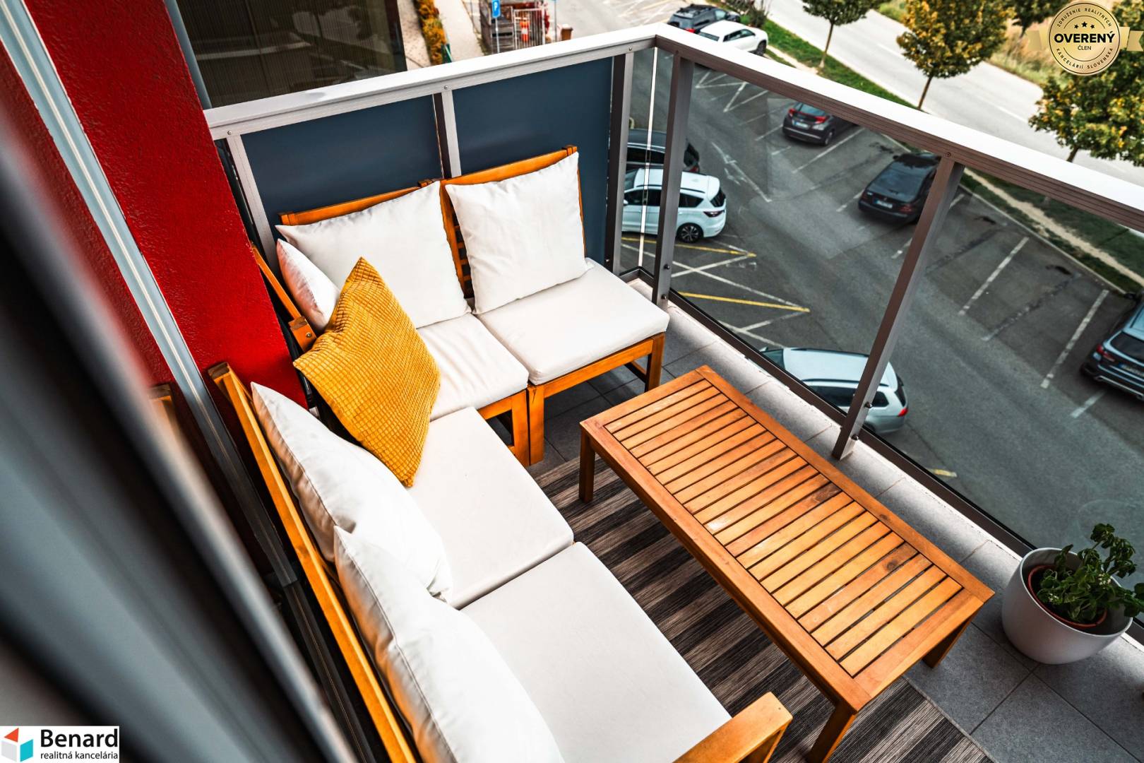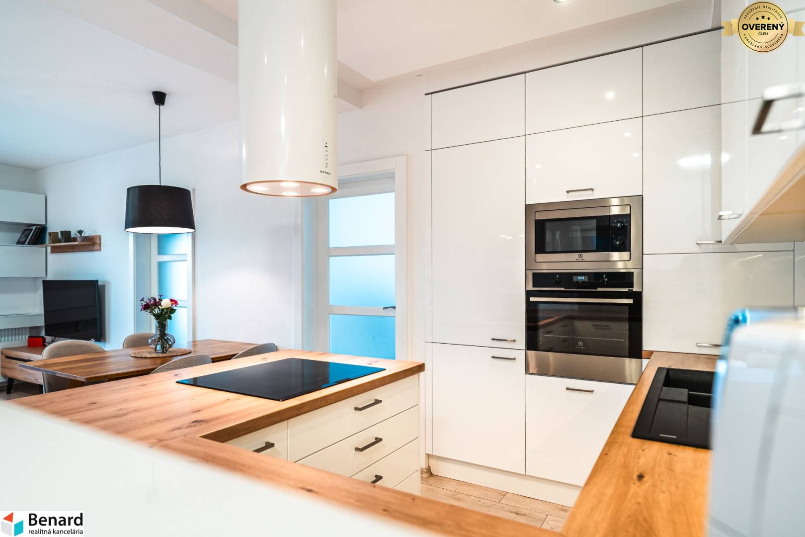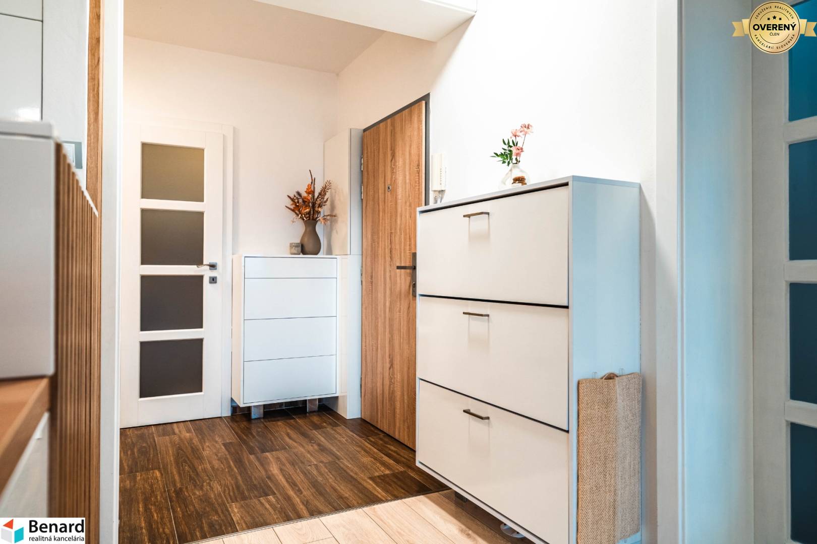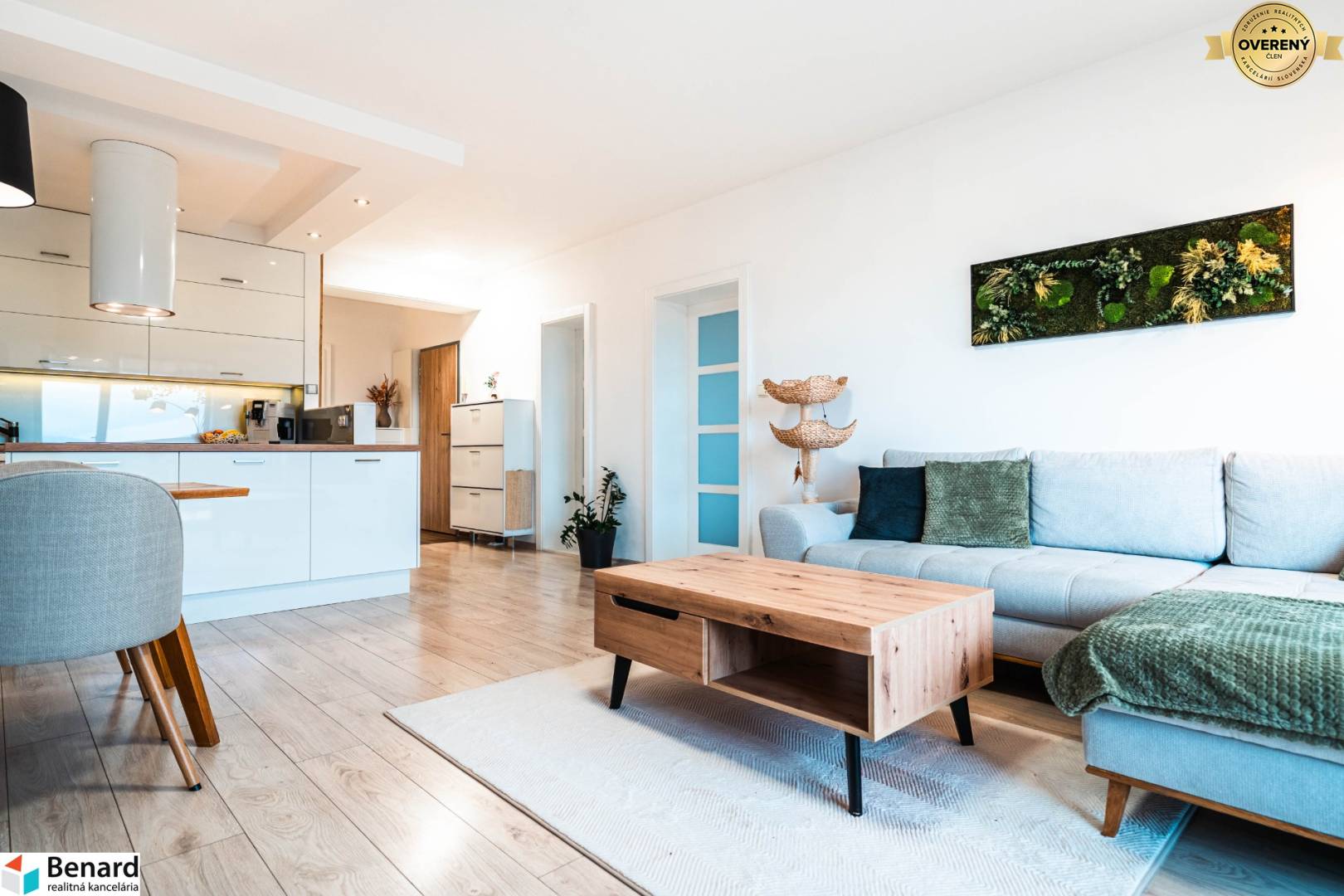 Hľadáte priestranný a moderný byt už v skolaudovanej novostavbe, ktorý je zariadený? Máme pre Vás na predaj 4-izbový byt s kumbálom, ktorý je oproti bytu, priamo na poschodí. Nehnuteľnosť sa nachádza na Jelšovej ulici, v obľúbenom projekte Panoráma. Ak si potrpíte na prostredie, v ktorom žijete a túžite po čerstvom vzduchu, či výhľade na lúky a lesy, tak Panoráma je pre vás ideálnou voľbou. Okolitá príroda a les ponúkajú pestré možnosti oddychu a rekreácie. Nájdete tu materskú školu, ohradený areál, kde sú detské ihriská, krásne a záhradníkom udržiavané pozemky, aj zastávku MHD. Rodičia určite ocenia, že za bytovými domami sa nachádza 250 metrov dlhý a oplotený dvor, kde sa môžu ich deti bezpečne hrať. Jednoducho všetko, čo potrebujete pre pohodlný, každodenný život. Táto lokalita je ideálnym miestom pre rodiny a pre komunitný život. Bytový dom je postavený z tehly a je zateplený prírodným materiálom, s 15-centimetrovou minerálnou vlnou. V bytovke sú štyri poschodia a predávaná nehnuteľnosť sa nachádza na 3. p. Byt je priestranný a má skvelé rozloženie. Spálňa, detská izba a pracovňa majú samostatné vstupy, sú nepriechodné. Kupujúci určite ocenia, že v byte sú dve toalety a dva samostatné balkóny, na ktoré sa dostanete z obývačky a zo spálne. Môžete si tak vychutnávať výhľady na okolitú prírodu. V dennej časti sa nachádza spojená obývačka s kuchyňou, kde je klimatizácia. V byte sú kvalitné okná s trojsklom. V bytovke sa nachádza plynová kotolňa, ktorá slúži na vykurovanie a ohrev úžitkovej vody, preto sú tu nízke mesačné náklady. Výhodou bytu je praktický kumbál, umiestnený oproti bytu, ktorý je zahrnutý v cene nehnuteľnosti. K bytu je možnosť dokúpiť parkovacie miesto priamo pri bytovom dome, ako aj pivnicu na prízemí bytového domu. Zakúpenie parkovacieho miesta ani pivnice nie je podmienkou kúpy. Cena parkovacieho miesta je 12 000 € a cena pivnice je 12 000 €. Výhody Vášho budúceho domova sú: - nízke mesačné náklady, - byt je priestranný, - byt má dva balkóny s krásnym výhľadom, - k dispozícii je kumbál, ktorý sa nachádza oproti bytu, - tiché bývanie s množstvom zelene, - možnosť zakúpiť si parkovacie miesto, ktoré je hneď pri bytovom dome, - možnosť zakúpiť si pivnicu, ktorá je na prízemí bytového domu, - celková plocha bytu je 102 m2 a plocha obytných miestností je 92,43 m2. Príďte sa o týchto, a aj iných výhodách presvedčiť sami a rezervujte si obhliadku na čísle 0903 367 922.
