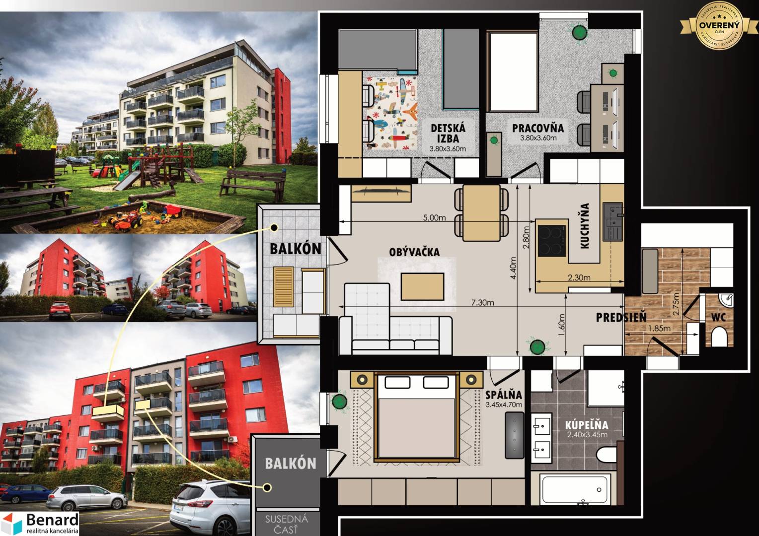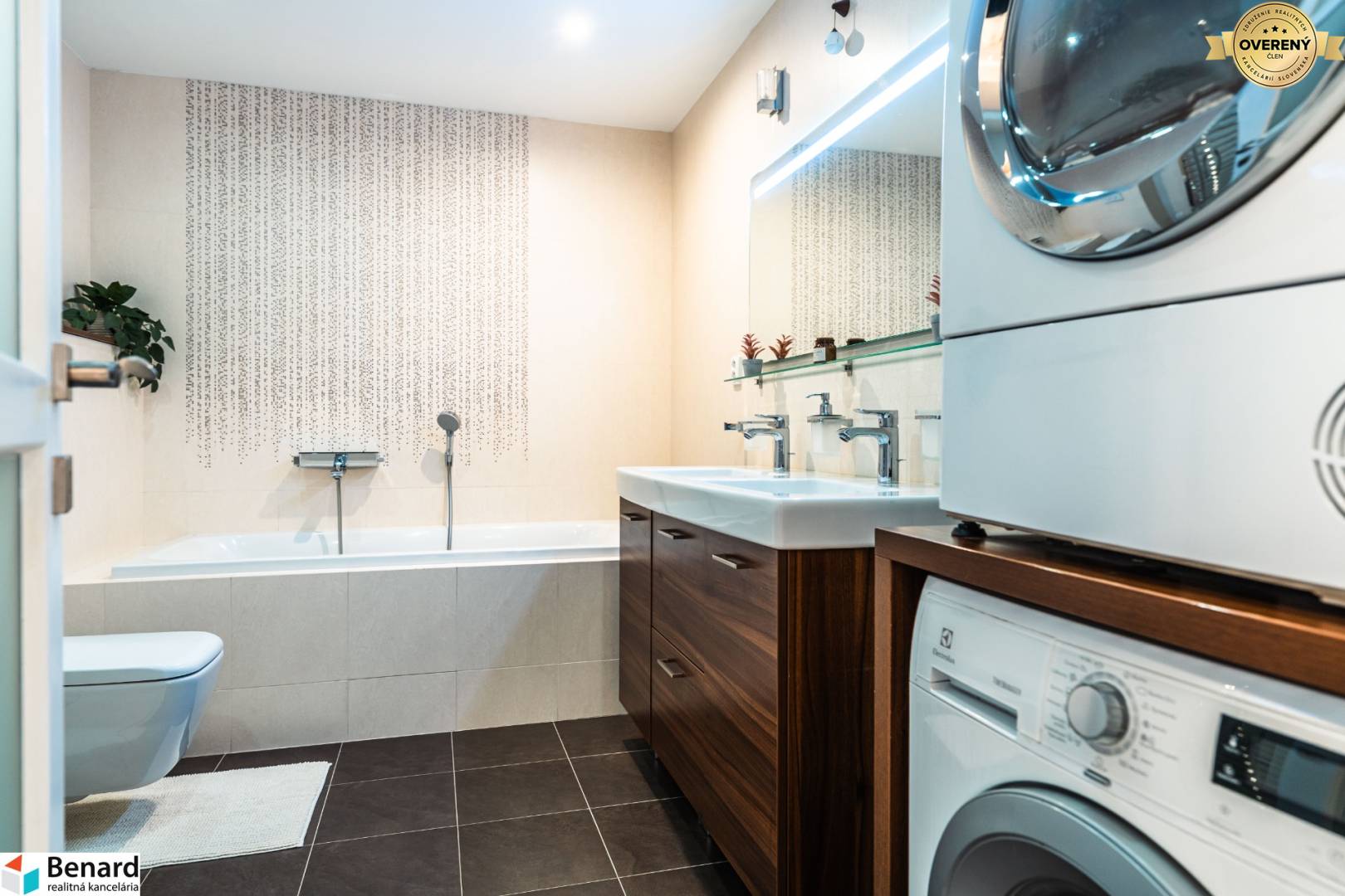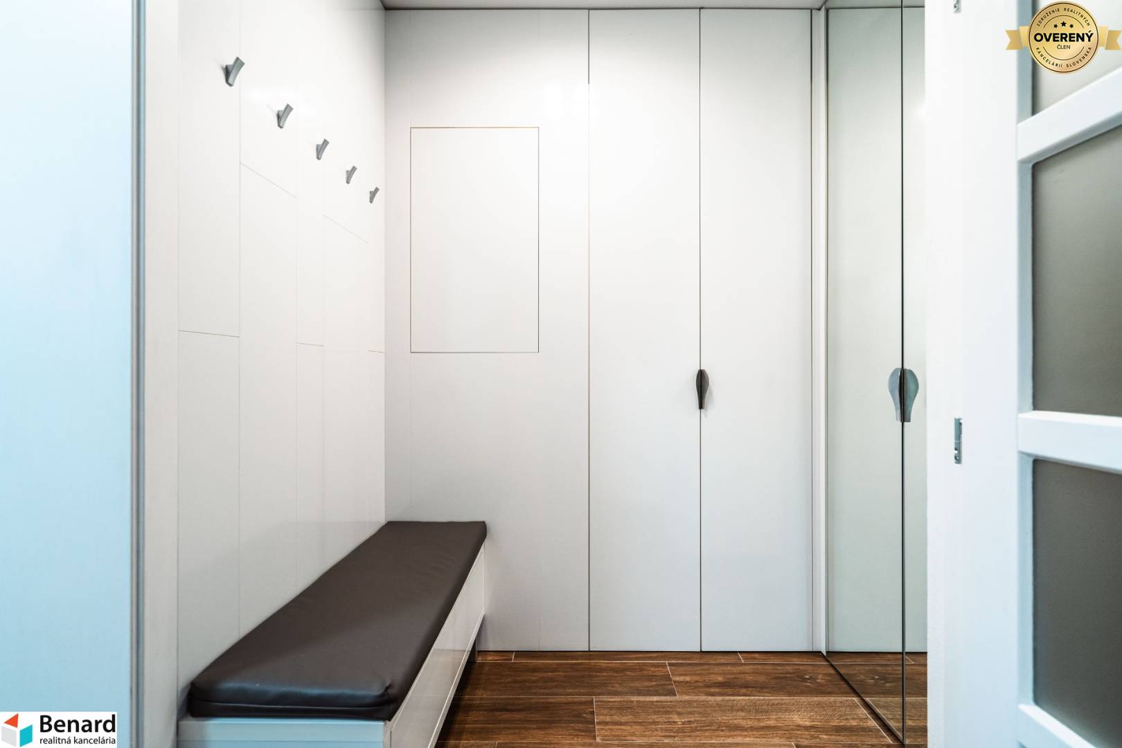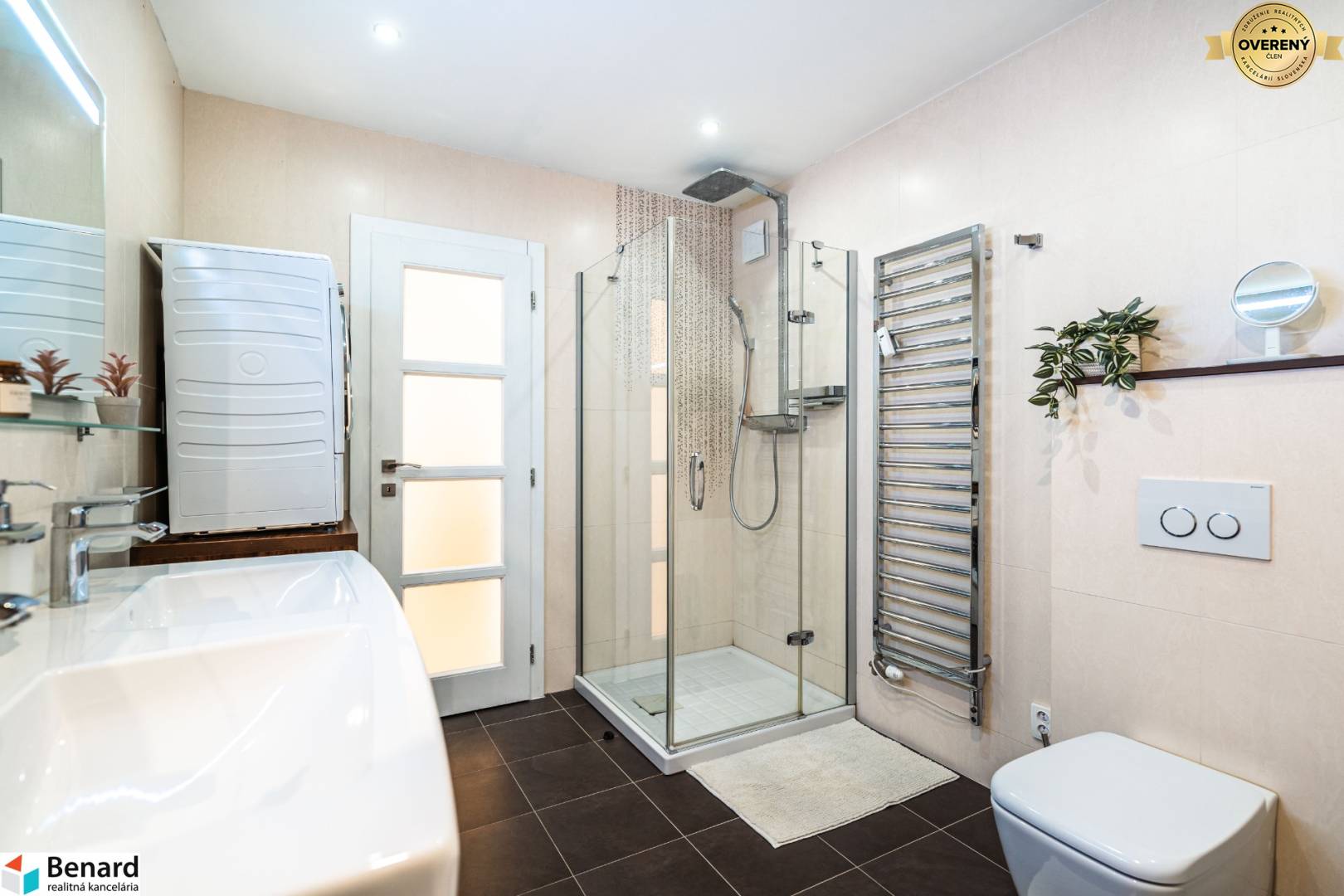 Hľadáte priestranný a moderný byt už v skolaudovanej novostavbe, ktorý je zariadený? Máme pre Vás na predaj 4-izbový byt s kumbálom, ktorý je oproti bytu, priamo na poschodí. Nehnuteľnosť sa nachádza na Jelšovej ulici, v obľúbenom projekte Panoráma. Ak si potrpíte na prostredie, v ktorom žijete a túžite po čerstvom vzduchu, či výhľade na lúky a lesy, tak Panoráma je pre vás ideálnou voľbou. Okolitá príroda a les ponúkajú pestré možnosti oddychu a rekreácie. Nájdete tu materskú školu, ohradený areál, kde sú detské ihriská, krásne a záhradníkom udržiavané pozemky, aj zastávku MHD. Rodičia určite ocenia, že za bytovými domami sa nachádza 250 metrov dlhý a oplotený dvor, kde sa môžu ich deti bezpečne hrať. Jednoducho všetko, čo potrebujete pre pohodlný, každodenný život. Táto lokalita je ideálnym miestom pre rodiny a pre komunitný život. Bytový dom je postavený z tehly a je zateplený prírodným materiálom, s 15-centimetrovou minerálnou vlnou. V bytovke sú štyri poschodia a predávaná nehnuteľnosť sa nachádza na 3. p. Byt je priestranný a má skvelé rozloženie. Spálňa, detská izba a pracovňa majú samostatné vstupy, sú nepriechodné. Kupujúci určite ocenia, že v byte sú dve toalety a dva samostatné balkóny, na ktoré sa dostanete z obývačky a zo spálne. Môžete si tak vychutnávať výhľady na okolitú prírodu. V dennej časti sa nachádza spojená obývačka s kuchyňou, kde je klimatizácia. V byte sú kvalitné okná s trojsklom. V bytovke sa nachádza plynová kotolňa, ktorá slúži na vykurovanie a ohrev úžitkovej vody, preto sú tu nízke mesačné náklady. Výhodou bytu je praktický kumbál, umiestnený oproti bytu, ktorý je zahrnutý v cene nehnuteľnosti. K bytu je možnosť dokúpiť parkovacie miesto priamo pri bytovom dome, ako aj pivnicu na prízemí bytového domu. Zakúpenie parkovacieho miesta ani pivnice nie je podmienkou kúpy. Cena parkovacieho miesta je 12 000 € a cena pivnice je 12 000 €. Výhody Vášho budúceho domova sú: - nízke mesačné náklady, - byt je priestranný, - byt má dva balkóny s krásnym výhľadom, - k dispozícii je kumbál, ktorý sa nachádza oproti bytu, - tiché bývanie s množstvom zelene, - možnosť zakúpiť si parkovacie miesto, ktoré je hneď pri bytovom dome, - možnosť zakúpiť si pivnicu, ktorá je na prízemí bytového domu, - celková plocha bytu je 102 m2 a plocha obytných miestností je 92,43 m2. Príďte sa o týchto, a aj iných výhodách presvedčiť sami a rezervujte si obhliadku na čísle 0903 367 922.