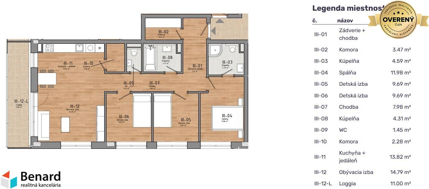 Dispozične pozostáva zo zádveria, chodby, obývacej izby s kuchyňou, troch samostatných spální, 2x komory, loggie, 2x kúpeľne a WC.