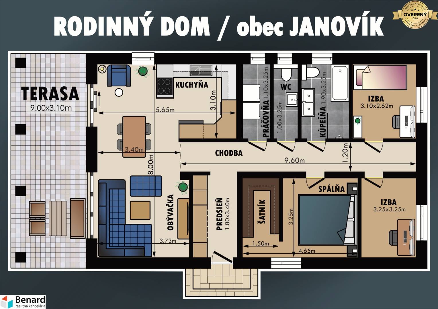 Hľadáte novostavbu bez nutnosti ďalších investícií, do ktorej sa môžete okamžite nasťahovať? Máme pre vás ideálnu nehnuteľnosť. Ponúkame na predaj jednopodlažný rodinný dom v obci Janovík, ktorá sa nachádza len pár minút od miest Prešov (18 min) a Košice (15 min). Vďaka svojej výbornej polohe a rýchlemu dopravnému napojeniu sa Janovík stáva čoraz obľúbenejšou lokalitou pre rodinné bývanie. V obci prebieha nová výstavba domov, čo potvrdzuje jej rastúcu atraktívnosť. Nehnuteľnosť sa nachádza v novovybudovanej časti obce, mimo hlavného ťahu, a ponúka tiché, komunitné prostredie ideálne pre rodiny s deťmi či ľudí, ktorí hľadajú pokojné bývanie s dobrou dostupnosťou do mesta. V obci nájdete potraviny, kostol, ranč s koňmi, detské aj multifunkčné ihrisko. Materská škôlka, základná škola a lekár sa nachádzajú vo vedľajšej obci Lemešany. Rodinný dom bol skolaudovaný v roku 2021 a je postavený z tehál Porotherm, čo zaručuje kvalitnú a pevnú konštrukciu s výbornými tepelnoizolačnými vlastnosťami. Je jednopodlažný, s neobytným podkrovím. Zastavaná plocha domu je 148 m² a úžitková plocha je 97,28 m². Dom je napojený na obecnú vodu a elektrickú sieť, odkanalizovanie je riešené žumpou s objemom 9 m³. Na pozemku sa nachádza montovaná garáž s elektrickou prípojkou, pred ktorou je prístrešok pre ďalšie auto. Veľkosť pozemku je 343 m². Dom je vybavený kamerovým systémom, plastovými oknami s trojsklom a podlahovým kúrením, ktoré v kúpeľni dopĺňa radiátor. Dom disponuje týmito miestnosťami: vstupná chodba, obývačka prepojená s kuchyňou a jedálňou, spálňa s vlastným šatníkom, dve samostatné izby, kúpeľňa s toaletou, samostatná toaleta a technická miestnosť. Z dennej časti domu sa dostanete na útulnú terasu, kde si môžete vychutnávať voľné chvíle. Cena nehnuteľnosti je na vyžiadanie v realitnej kancelárii. Viac informácií vám radi poskytneme pri osobnej obhliadke alebo prostredníctvom telefonickej či e-mailovej komunikácie. K dispozícii máme aj aktuálny znalecký posudok, ktorý Vám radi ukážeme pri prehliadke domu.