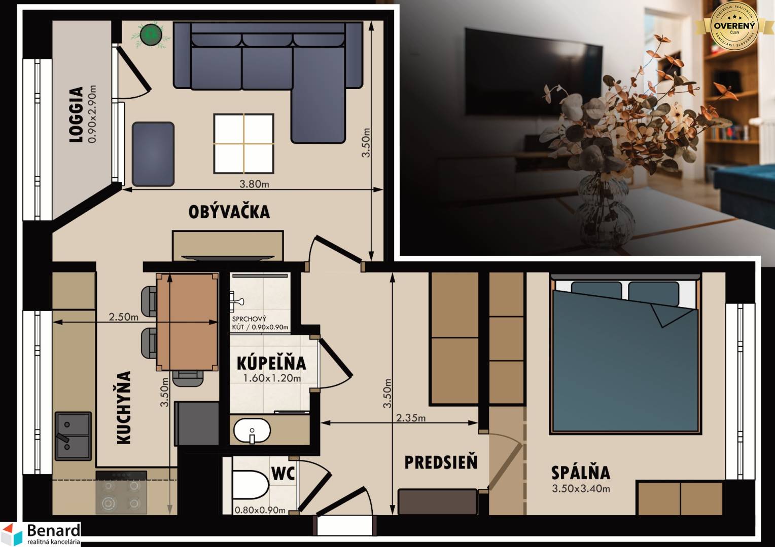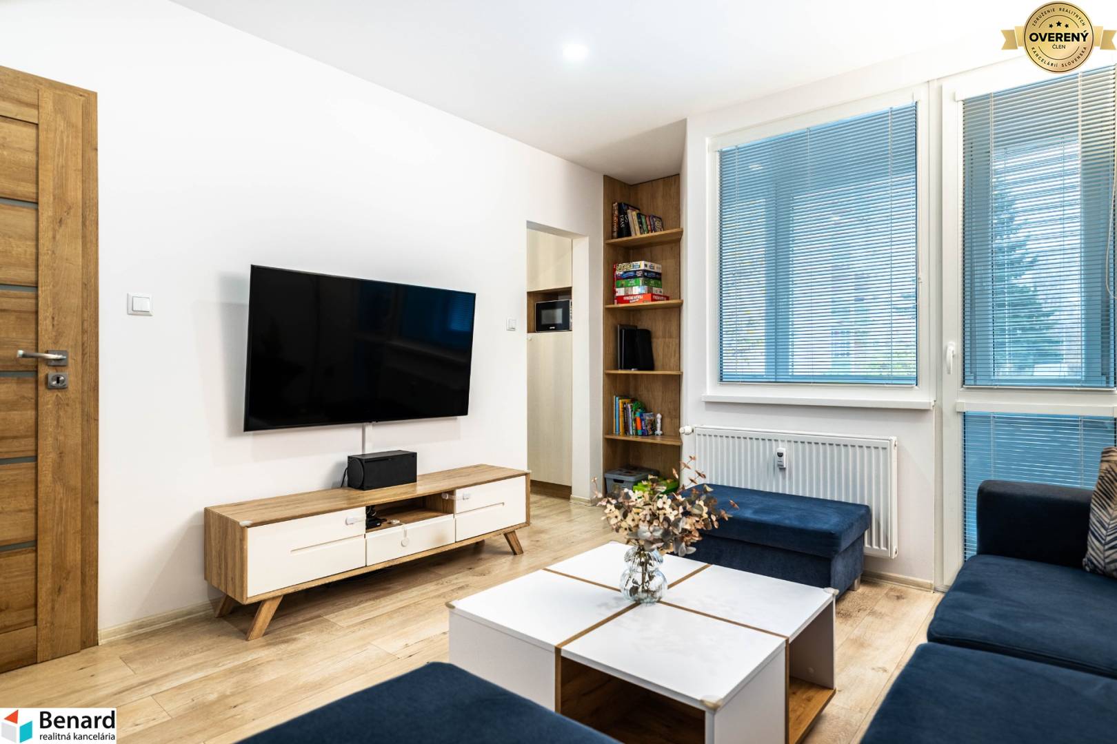 Byt sa nachádza na prízemí bytového domu, disponuje vnútornou loggiou a pred piatimi rokmi prešiel kompletnou rekonštrukciou. Je kompletne zariadený, takže nový majiteľ ho môže po kúpe ihneď užívať bez nutnosti ďalšieho zariaďovania. Praktické vstavané skrine v byte poskytujú dostatok úložného priestoru. Spálňa má samostatný vchod, čo zaručuje súkromie a kúpeľňa je oddelená od toalety. K bytu patrí aj murovaná pivnica. Celková výmera nehnuteľnosti je 51,57 m².