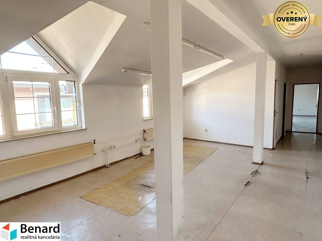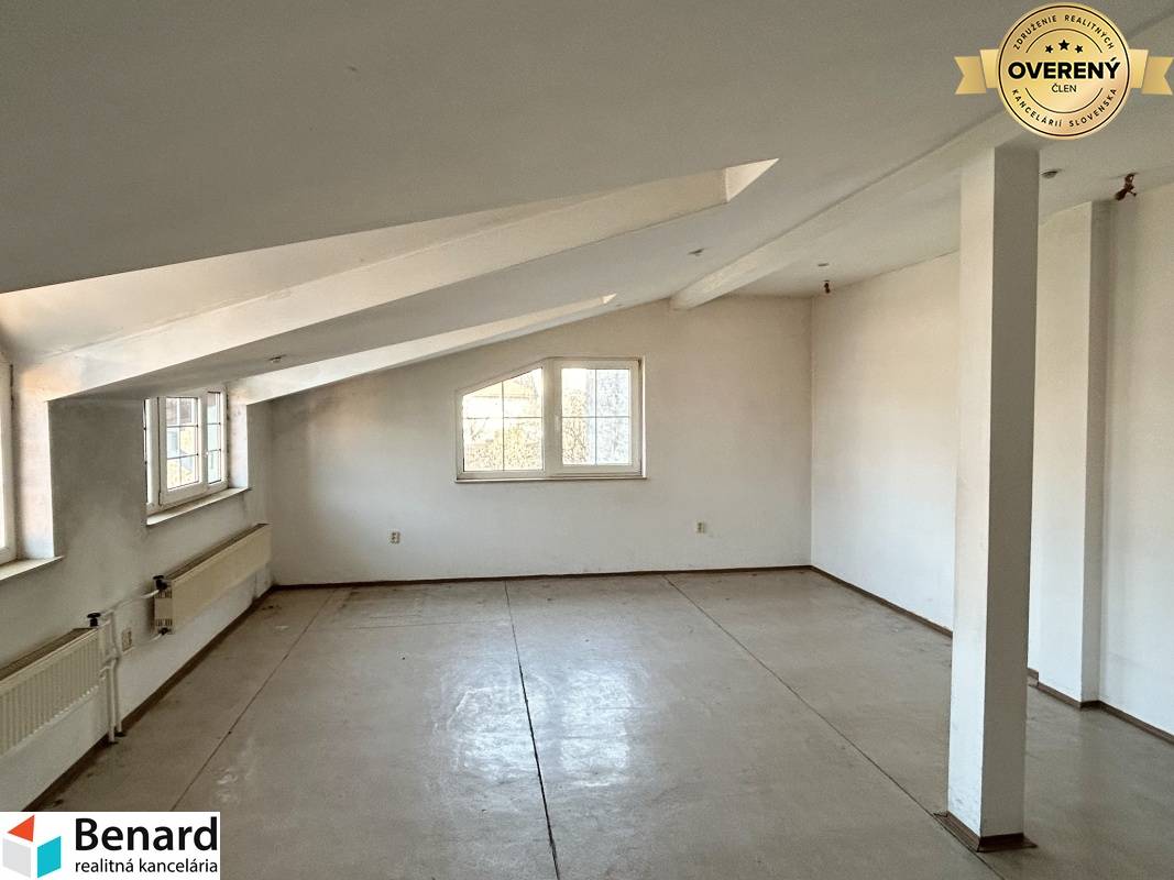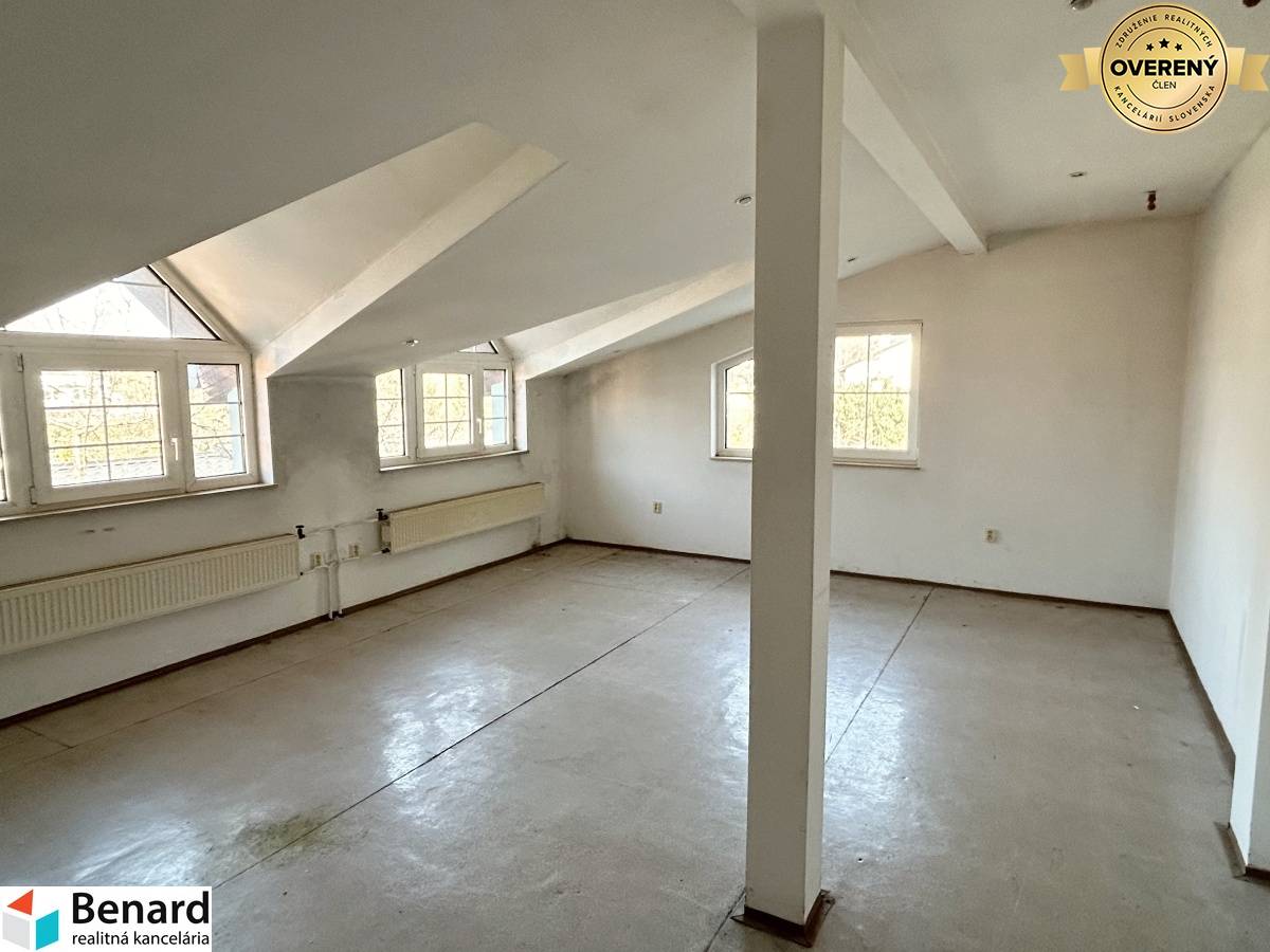 poschodie: pozostáva z chodby, 3 miestností, kuchynského kúta, soc. zariadenia. Tento priestor je určený na bývanie, príp. kancelárie ( možnosť urobiť napr. 2 byty)