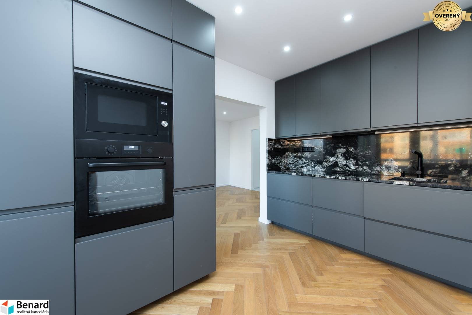 • Kuchyňa: Linka na mieru s masívnou žulovou pracovnou doskou a zástenou Titanium (30 mm). Vstavané spotrebiče (chladnička, umývačka, rúra, mikrovlnka, digestor) sú v záruke 5 rokov.
