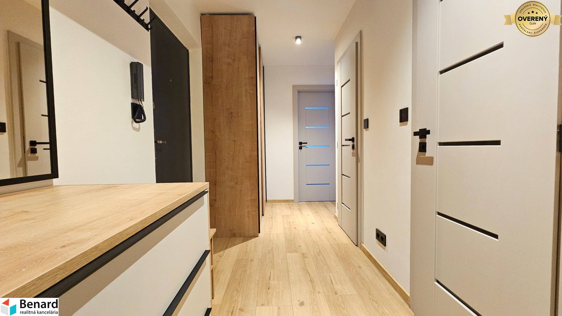 Byt prešiel kompletnou rekonštrukciou (56 m²) a nachádza sa na najvyššom 3. poschodí, čo vám zaručí maximálne súkromie bez susedov nad hlavou. Celý interiér je ladený do jemných kašmírových odtieňov v kombinácii s teplým drevom a svetlou béžovou, čo vytvára hrejivú a nadčasovú atmosféru. Kvalitné batérie značky Grohe a nábytok na mieru len podčiarkujú vysoký štandard tohto bývania. Lokalita ponúka dokonalú dostupnosť – v tesnej blízkosti máte Lidl, OC Galéria aj zastávky MHD, takže všetko potrebné vybavíte pešo.
