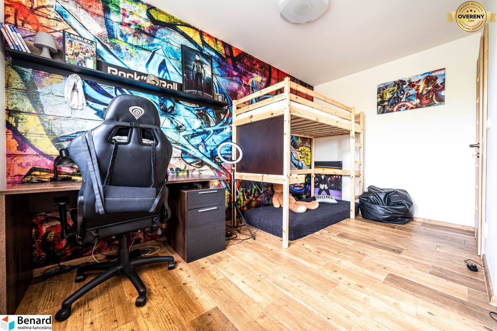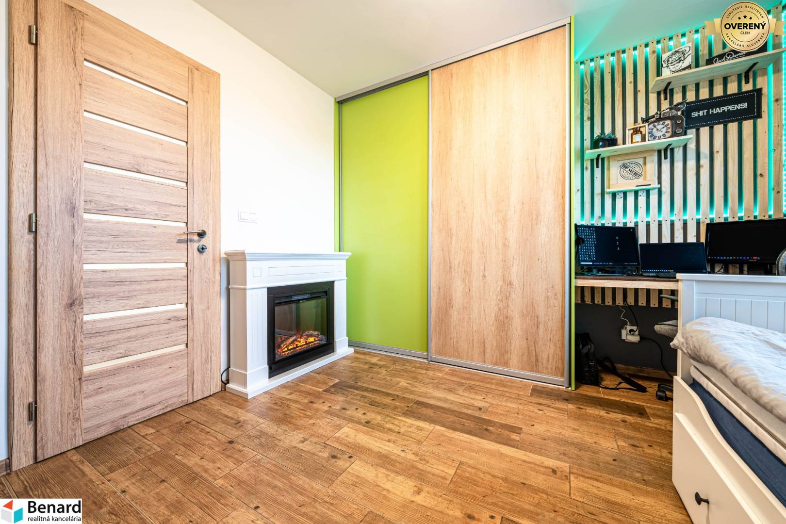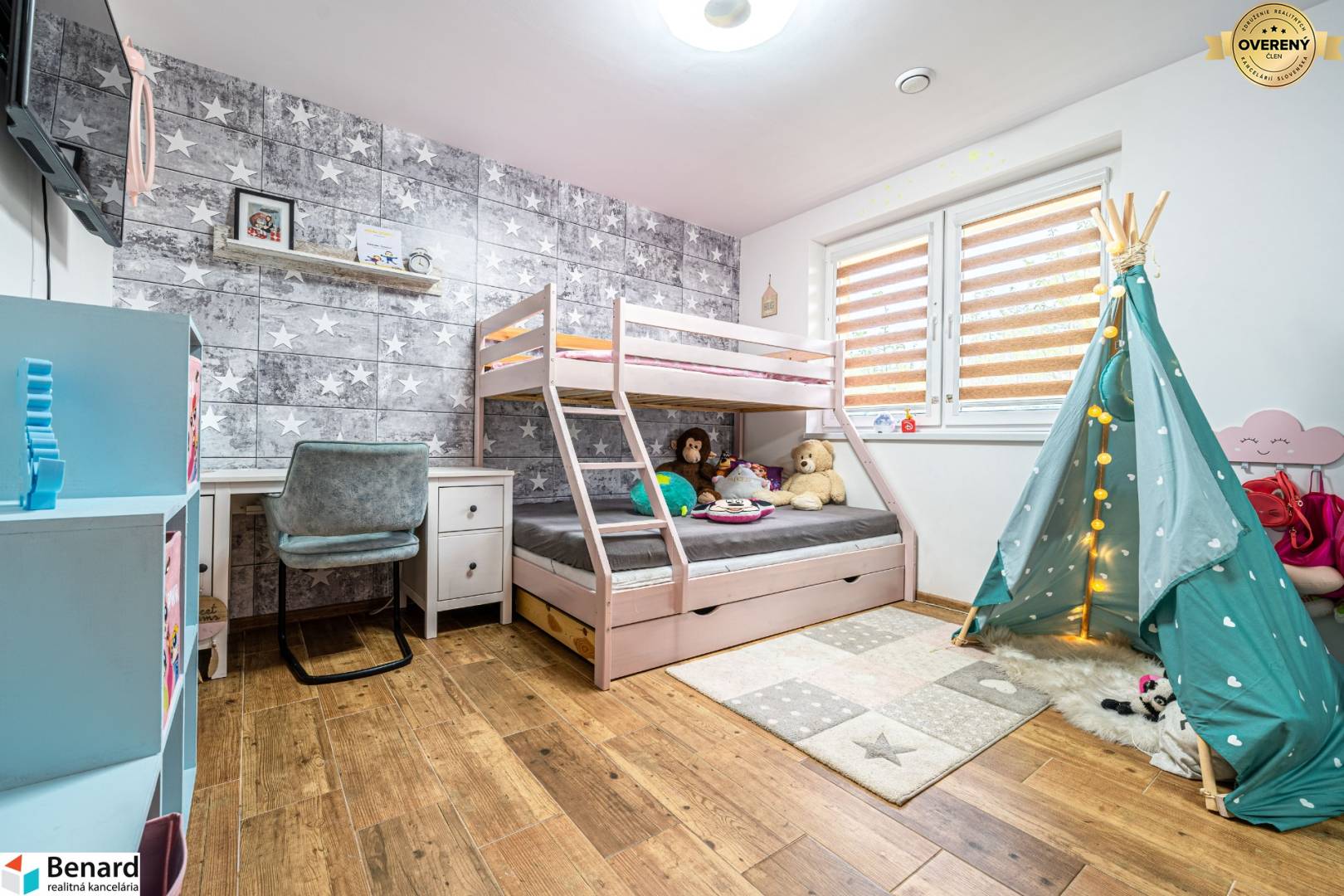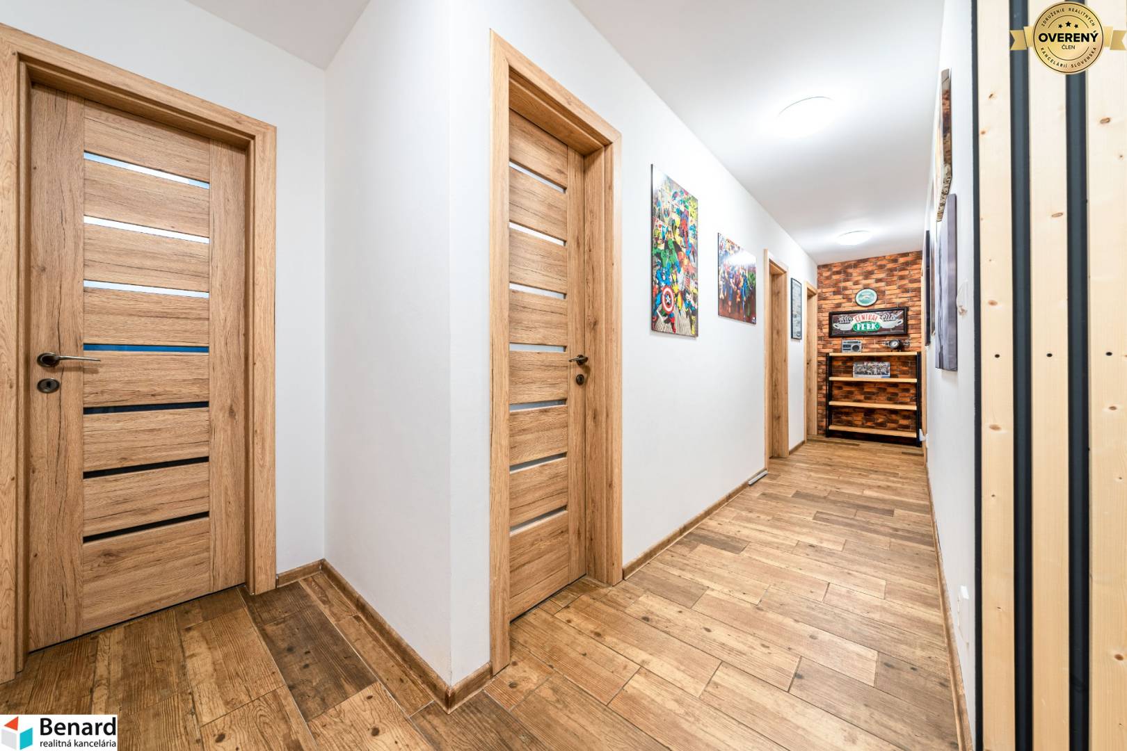 Pri vstupe do dennej časti domu Vás očarí moderná obývačka prepojená s kuchyňou, kde romantickú atmosféru vytvára krb nachádzajúci sa v kuchynskej časti. Vedľa priestrannej a plne vybavenej kuchyne sa nachádza veľká, potravinová komora. Určite oceníte, že spálňa má samostatný šatník a vlastnú kúpeľňu, vďaka čomu budete mať dostatok súkromia. Dom má tieto miestnosti: zádverie, chodba, komora, kuchyňa s jedálňou, ktorá je čiastočne prepojená s obývacou izbou, kúpeľňa s toaletou, pracovňa/hosťovská izba, dve detské izby, spálňa, ďalšia samostatná kúpeľňa, samostatná toaleta, technická miestnosť, šatník, terasa, garáž. V dome máte možnosť využiť aj podkrovie.