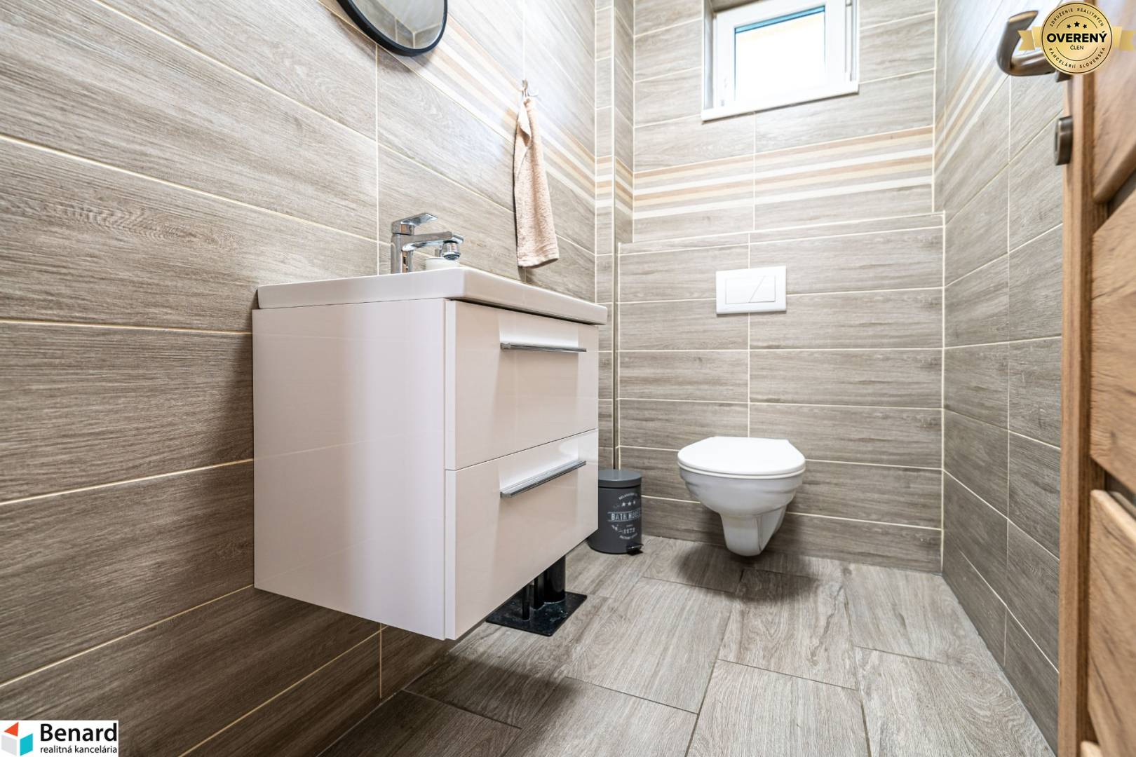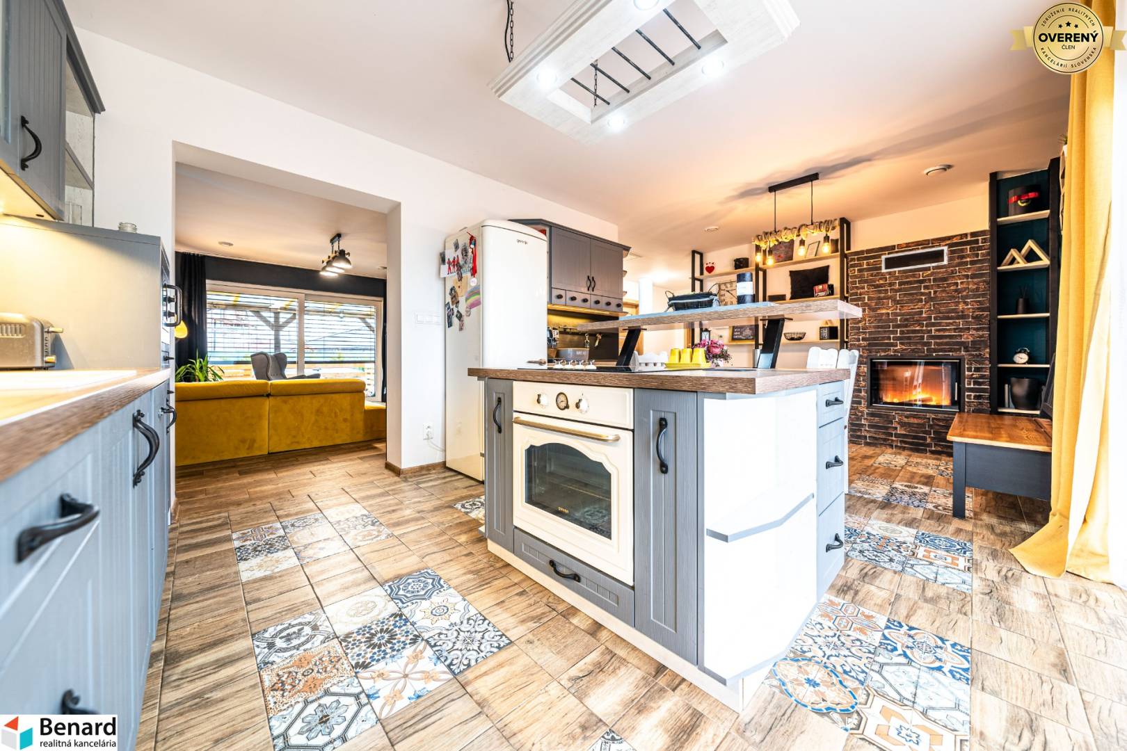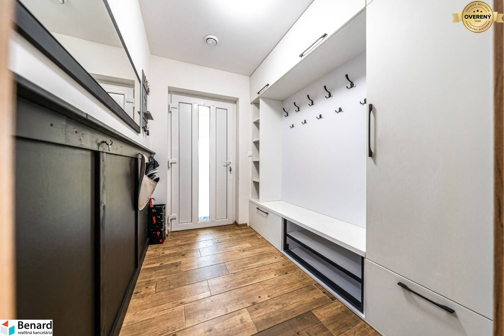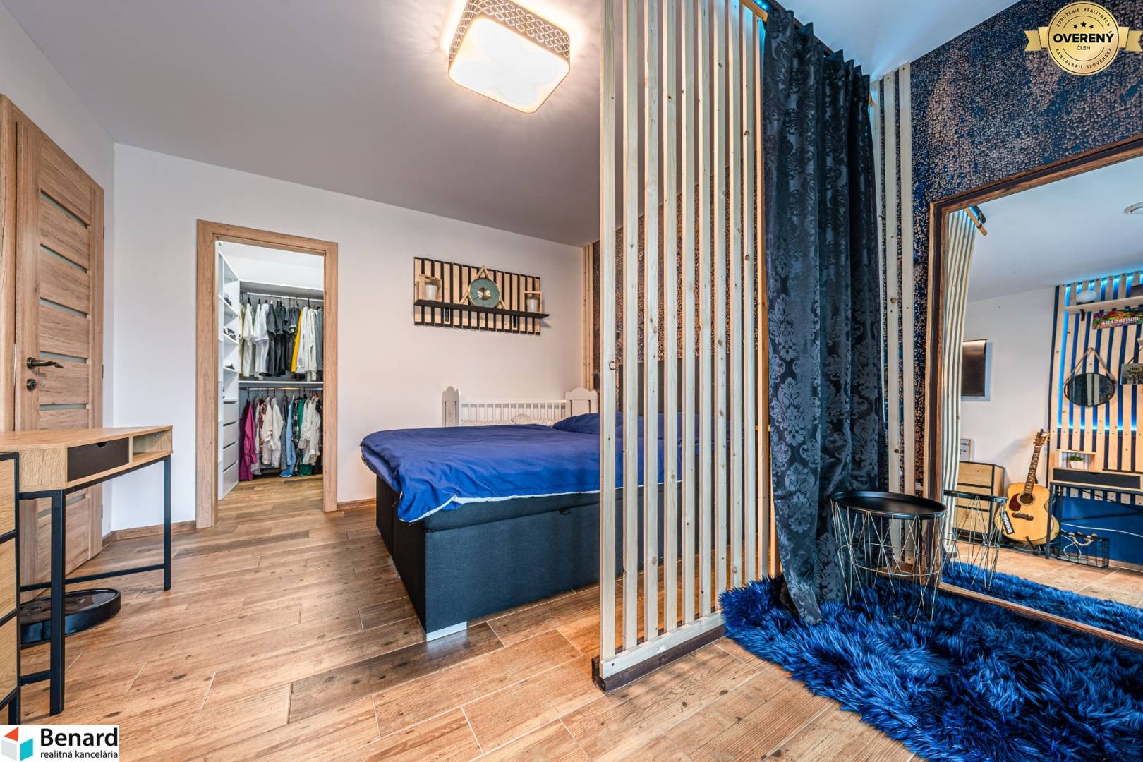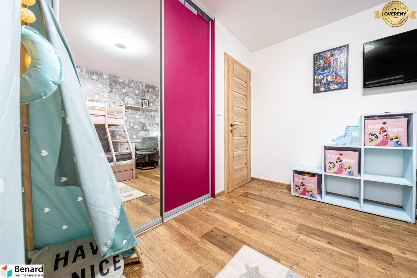 Pri vstupe do dennej časti domu Vás očarí moderná obývačka prepojená s kuchyňou, kde romantickú atmosféru vytvára krb nachádzajúci sa v kuchynskej časti. Vedľa priestrannej a plne vybavenej kuchyne sa nachádza veľká, potravinová komora. Určite oceníte, že spálňa má samostatný šatník a vlastnú kúpeľňu, vďaka čomu budete mať dostatok súkromia. Dom má tieto miestnosti: zádverie, chodba, komora, kuchyňa s jedálňou, ktorá je čiastočne prepojená s obývacou izbou, kúpeľňa s toaletou, pracovňa/hosťovská izba, dve detské izby, spálňa, ďalšia samostatná kúpeľňa, samostatná toaleta, technická miestnosť, šatník, terasa, garáž. V dome máte možnosť využiť aj podkrovie.