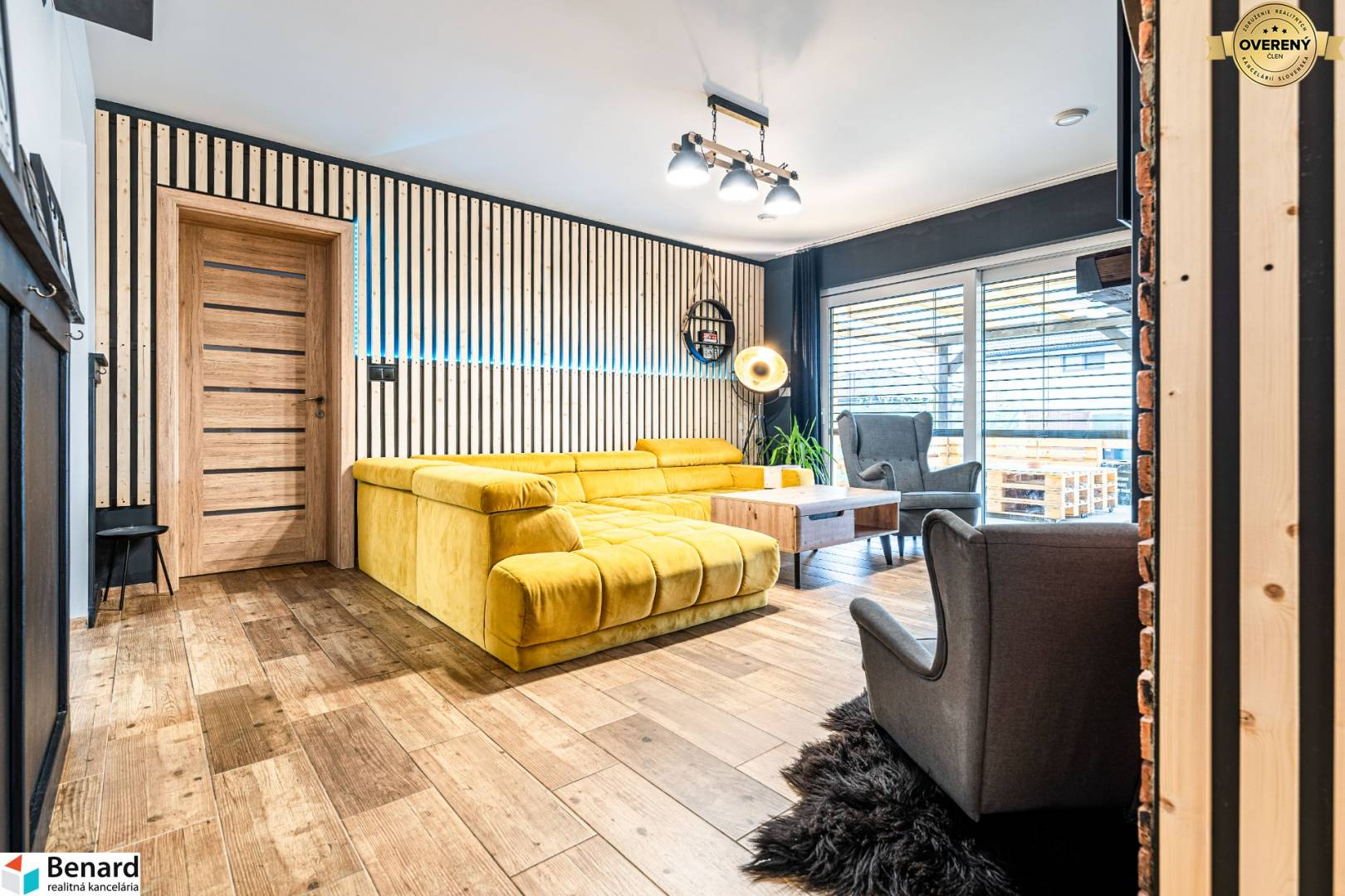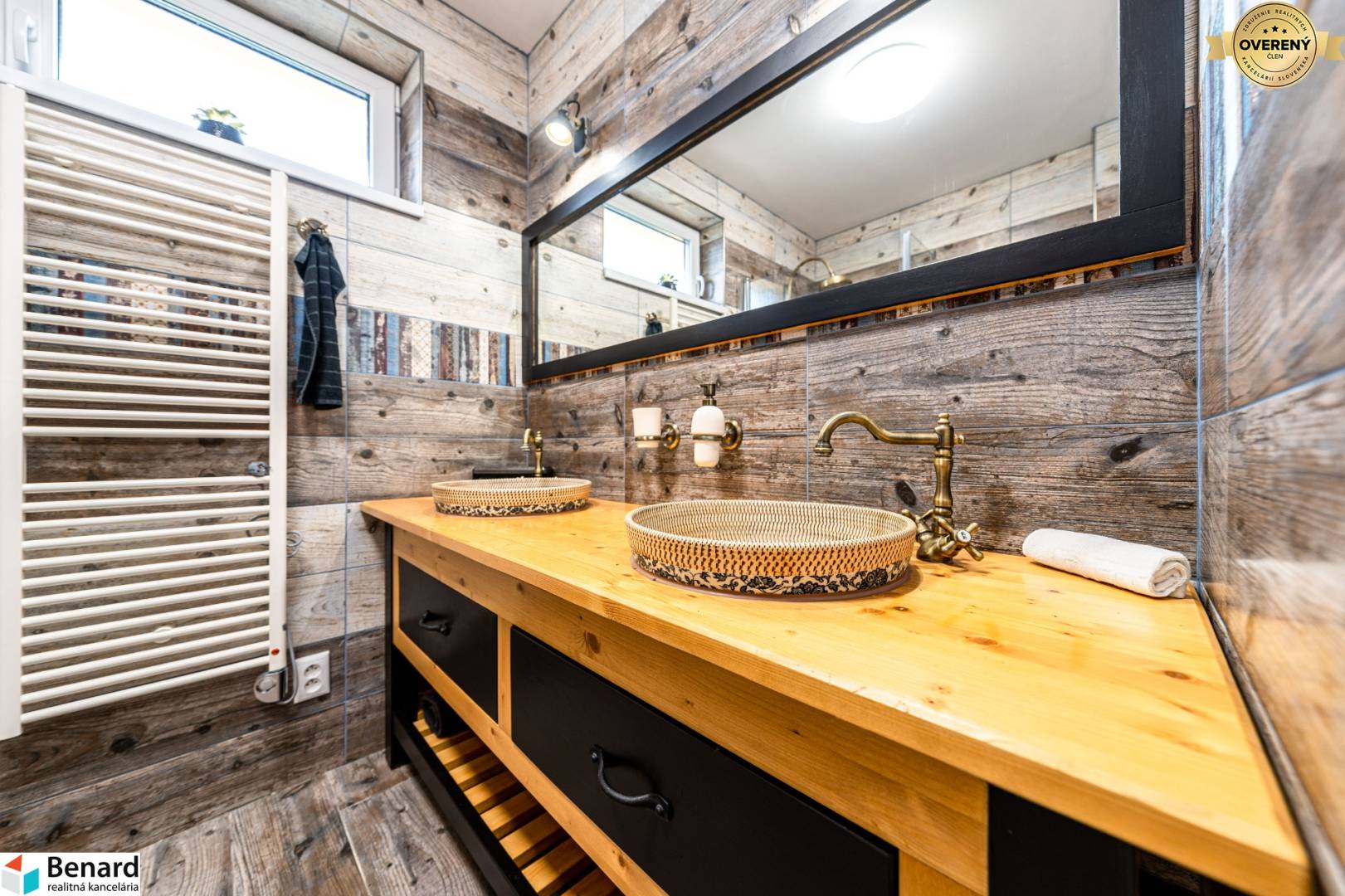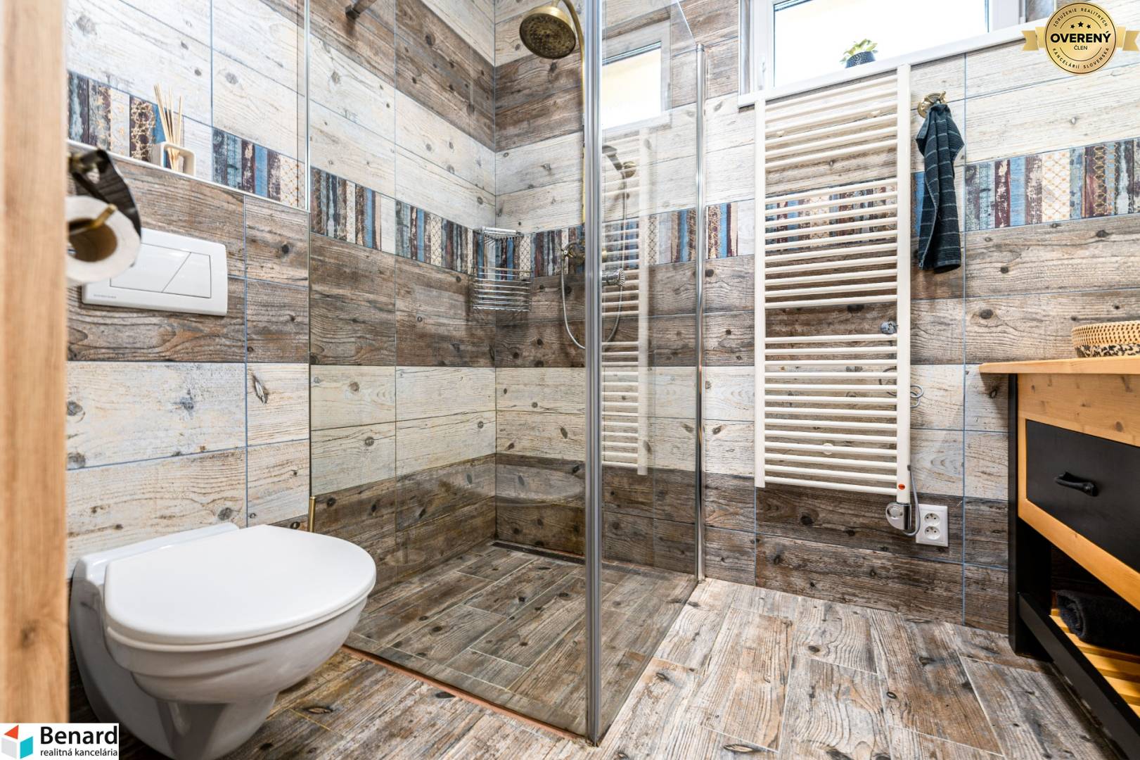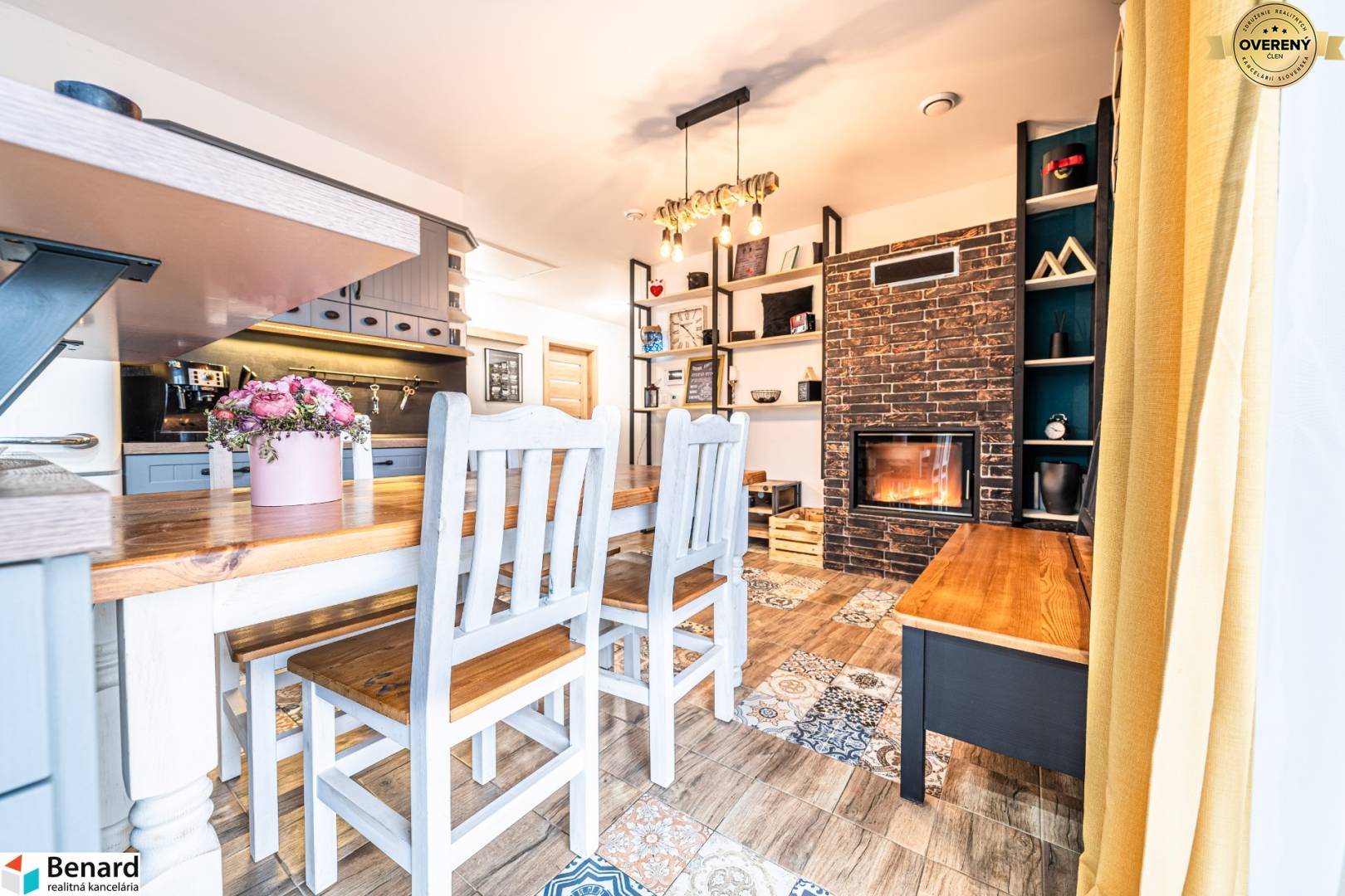 Pri vstupe do dennej časti domu Vás očarí moderná obývačka prepojená s kuchyňou, kde romantickú atmosféru vytvára krb nachádzajúci sa v kuchynskej časti. Vedľa priestrannej a plne vybavenej kuchyne sa nachádza veľká, potravinová komora. Určite oceníte, že spálňa má samostatný šatník a vlastnú kúpeľňu, vďaka čomu budete mať dostatok súkromia. Dom má tieto miestnosti: zádverie, chodba, komora, kuchyňa s jedálňou, ktorá je čiastočne prepojená s obývacou izbou, kúpeľňa s toaletou, pracovňa/hosťovská izba, dve detské izby, spálňa, ďalšia samostatná kúpeľňa, samostatná toaleta, technická miestnosť, šatník, terasa, garáž. V dome máte možnosť využiť aj podkrovie.