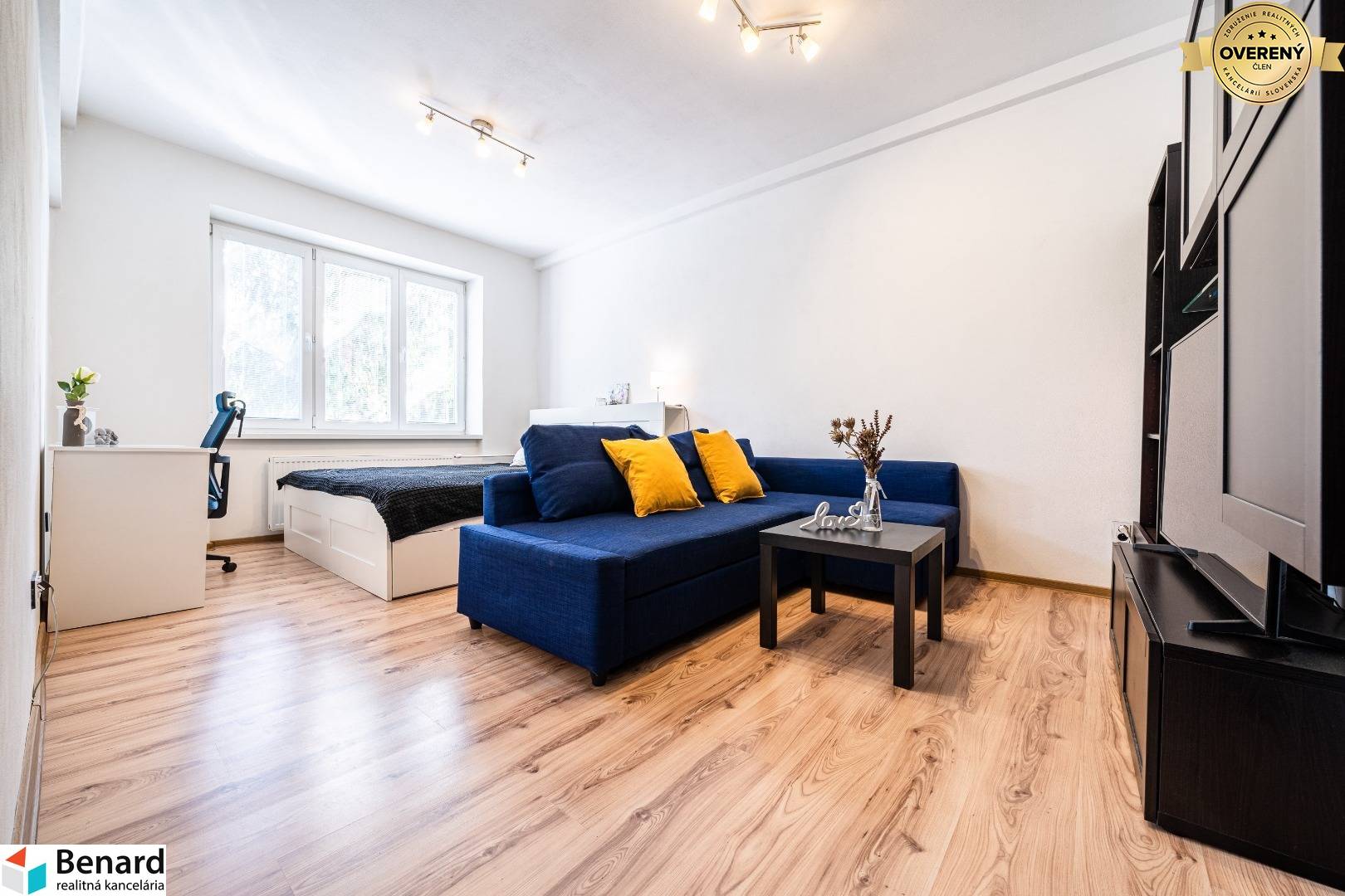 Tento byt prešiel kompletnou rekonštrukciou. Nájdete v ňom 2 nepriechodné izby. Nehnuteľnosť má celkovo až 62m2, čiže poskytuje dostatok priestoru pre spokojné bývanie. Je kompletne zariadený (nájdete v ňom vstavanú skriňu, 2 písacie stoly, 2 manželské postele, gauč, TV, kompletne vybavenú kuchyňu - vrátane riadu či iných kuchynských pomôcok,práčku,...). Tento byt sa nachádza na vyvýšenom 1.poschodí a nemá balkón. Domáce zvieratká sú v byte povolené.