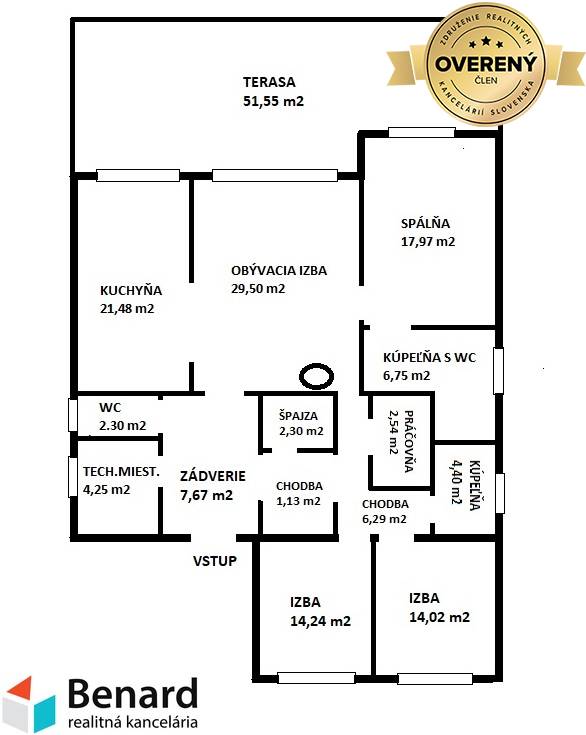 Pozostáva: zádverie(7,67m2), tech.miest.(4,25m2), hosťovské WC(2,30m2), kuchyňa(21,48m2), obývacia izba(29,50m2),spálňa(17,97m2), rodičovská kúpeľňa(6,75m2), práčovňa(2,54m2), chodba(6,29m2), kúpeľňa detí(4,40m2), izba(14,02m2), izba(14,24m2),chodba(3,70m2), špajza(2,30m2), terasa(51,55m2), pivnica(44m2)